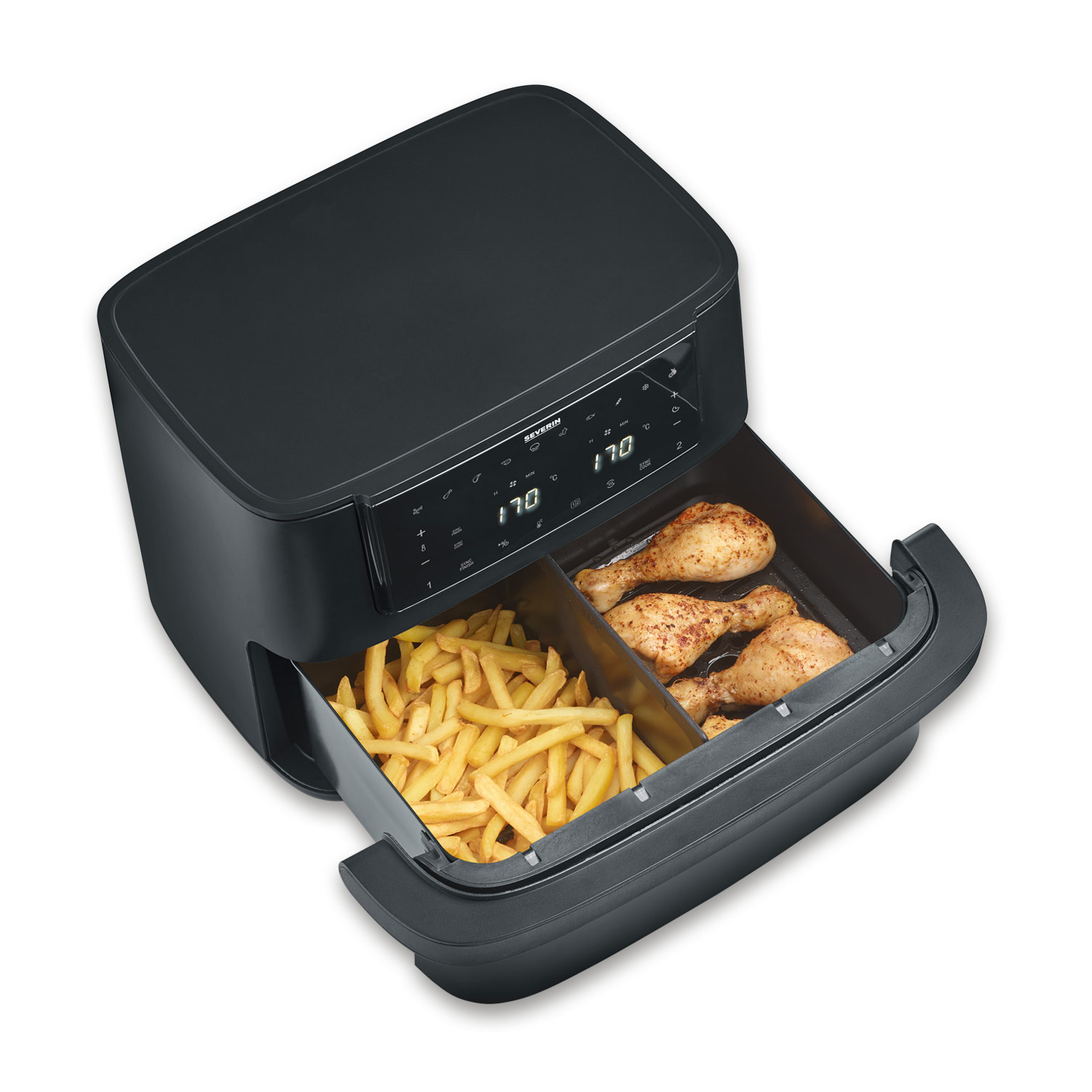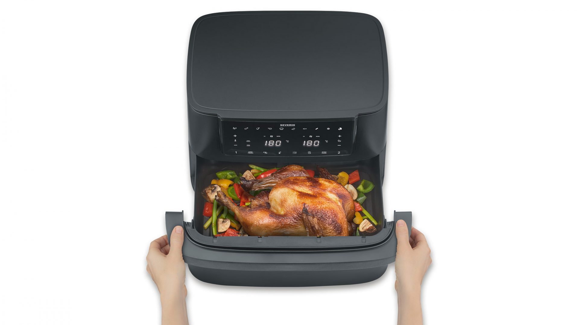 Mit der Heißluftfritteuse Black Line „Flex“ (FR 2490) bringt SEVERIN ein Modell auf den Markt, das perfekt zum modernen Familienleben und dem Wunsch nach gesunder Ernährung passt. Das clevere 2-in-1-Konzept bietet maximale Freiheit: Der großzügige Garraum lässt sich flexibel in zwei separat steuerbare Zonen aufteilen – oder als extra große Max-Zone nutzen. So gelingt die gleichzeitige Zubereitung verschiedener Speisen – etwa knuspriger Pommes und saftiger Chicken Wings – ganz unkompliziert.