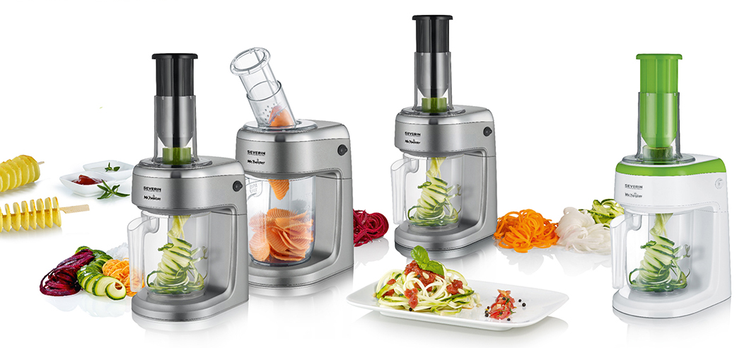 Für gesunde Abwechslung sorgt derweil der neue elektrische Spiralschneider „Mr. Twister“. In kürzester Zeit verarbeitet er festes Gemüse und Obst zu vielfältigen Gemüsespiralen und frischen Rohkostsalaten. Der elektrische Spiral- und Gemüseschneider KM 3923 verfügt über fünf Messer-Einsätze und einen zusätzlichen Schneideaufsatz. Mit Hilfe der beiden Schneideaufsätze und der fünf Messereinsätze sind insgesamt neun verschiedene Schneidevarianten möglich.