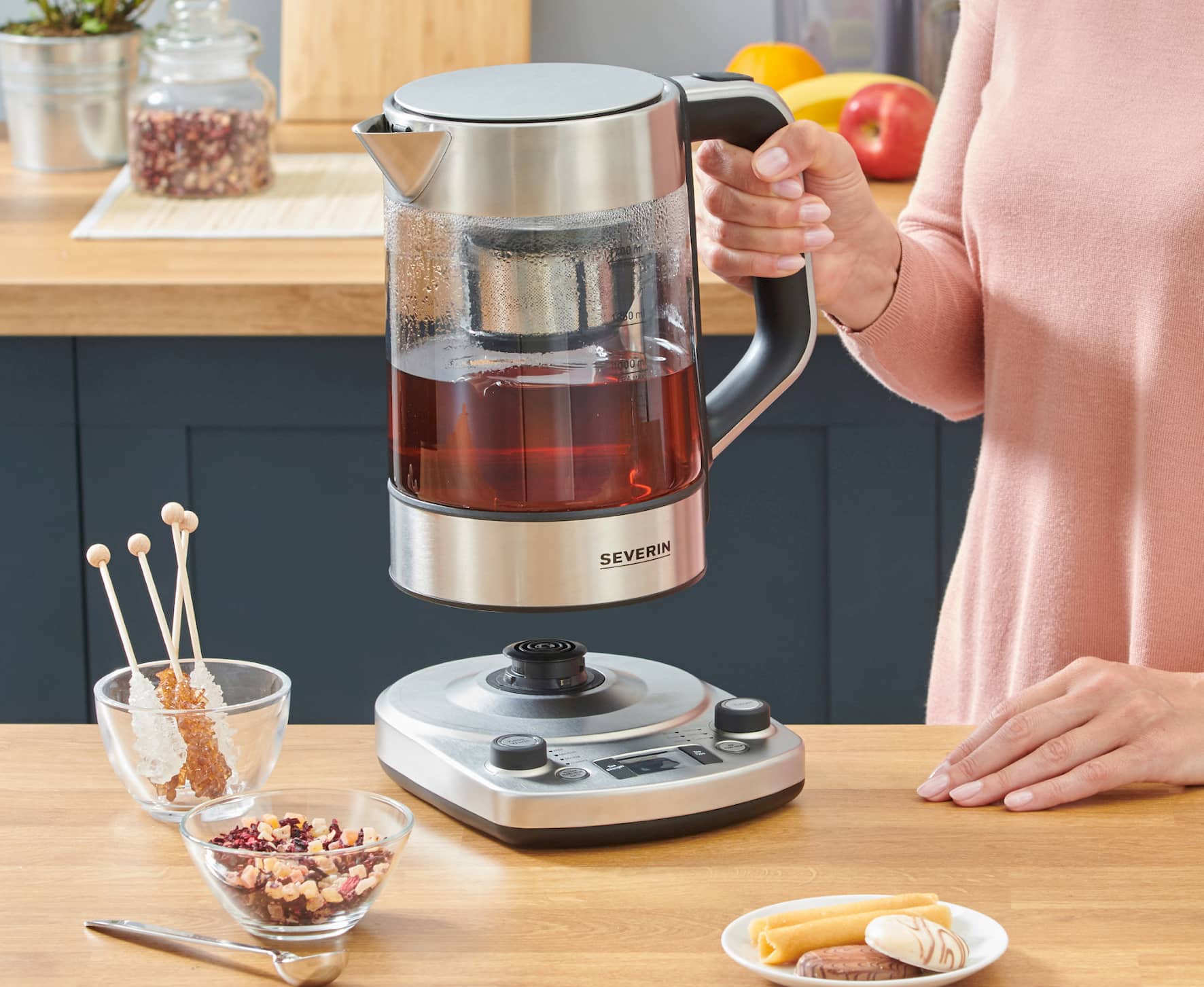 Für optimalen Teegenuss präsentiert Severin den Tee-/Wasserkocher Professional mit Auto-Lift Funktion. Fünf voreingestellte Teeprogramme sorgen dafür, dass Wassertemperatur und Ziehzeit immer auf den Punkt stimmen.