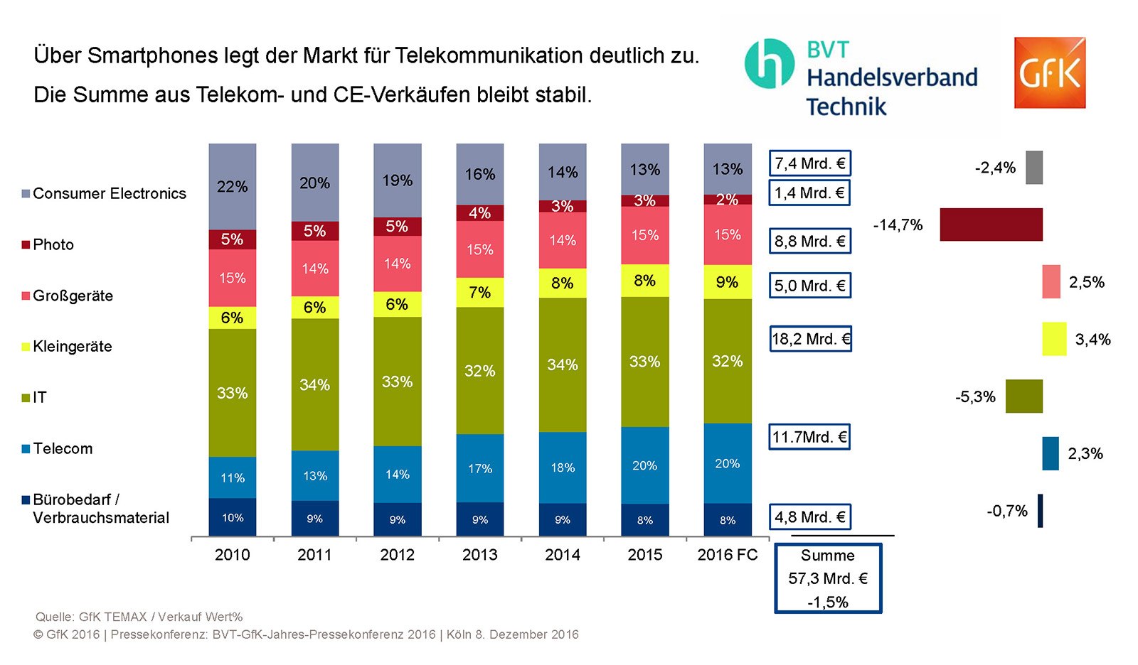 Besonders spannend: „Die weiße Ware zieht den Markt“, bilanzierte BVT-Geschäftsführer Willy Fischel bei einem Pressegespräch in Köln vergangene Woche. Der derzeitige Immobilienboom, verbunden mit dem Trend zur Küchenmodernisierung und Hausgeräten der neuesten Generation mit einem deutlichen mehr an Komfort, sorgen dafür, dass das Geschäft deutlich an Fahrt aufnehme. Unter dem Strich erwartet der BVT mit 57,3 Milliarden Euro in 2016 eine Marktentwicklung auf Vorjahresniveau (2015: 58,1 Mrd. Euro).