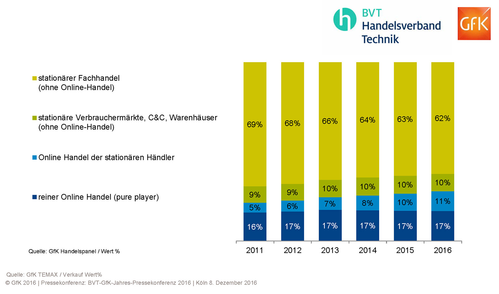 Viele stationäre Händler nehmen das Onlinewachstum mit. So verdoppelte sich ihr Internet-Marktanteil in den letzten fünf Jahren von 5 % in 2011 auf 11 % in 2016. Die Kunden wollen Multichannel und der Handel investiert in seine Zukunft. Das Ladenregal wird verlängert durch Verkaufsterminals und Tablets im Ladengeschäft. Fischel: „Der Kunde ist immer König – egal ob stationär oder online. Viele Händler zeigen ihren Kunden im Onlineshop in Echtzeit an, ob Ware im stationären Geschäft verfügbar ist. Die Kunden können dann Ware online bestellen oder reservieren und diese dann im Geschäft abholen, Beratung vor Ort inklusive.“