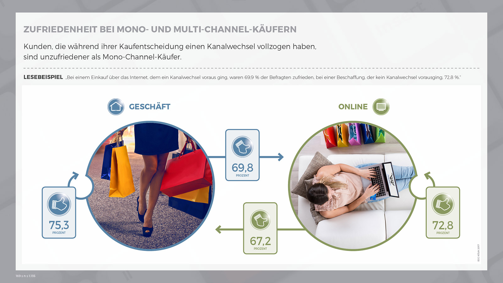 Während beim Mono-Channel-Kauf im Geschäft 75,3 Prozent der Konsumenten zufrieden sind, sinkt die Zufriedenheit bei Kanalwechslern von stationär zu online auf 69,8 Prozent. Ein ähnliches Bild zeigt sich auch in die andere Richtung: Bei den reinen Onlinekäufern liegt die Zufriedenheit bei 72,8 Prozent. Wechseln die Konsumenten nach der Onlinerecherche in den stationären Kanal, geben lediglich rund 67 Prozent an, zufrieden zu sein.