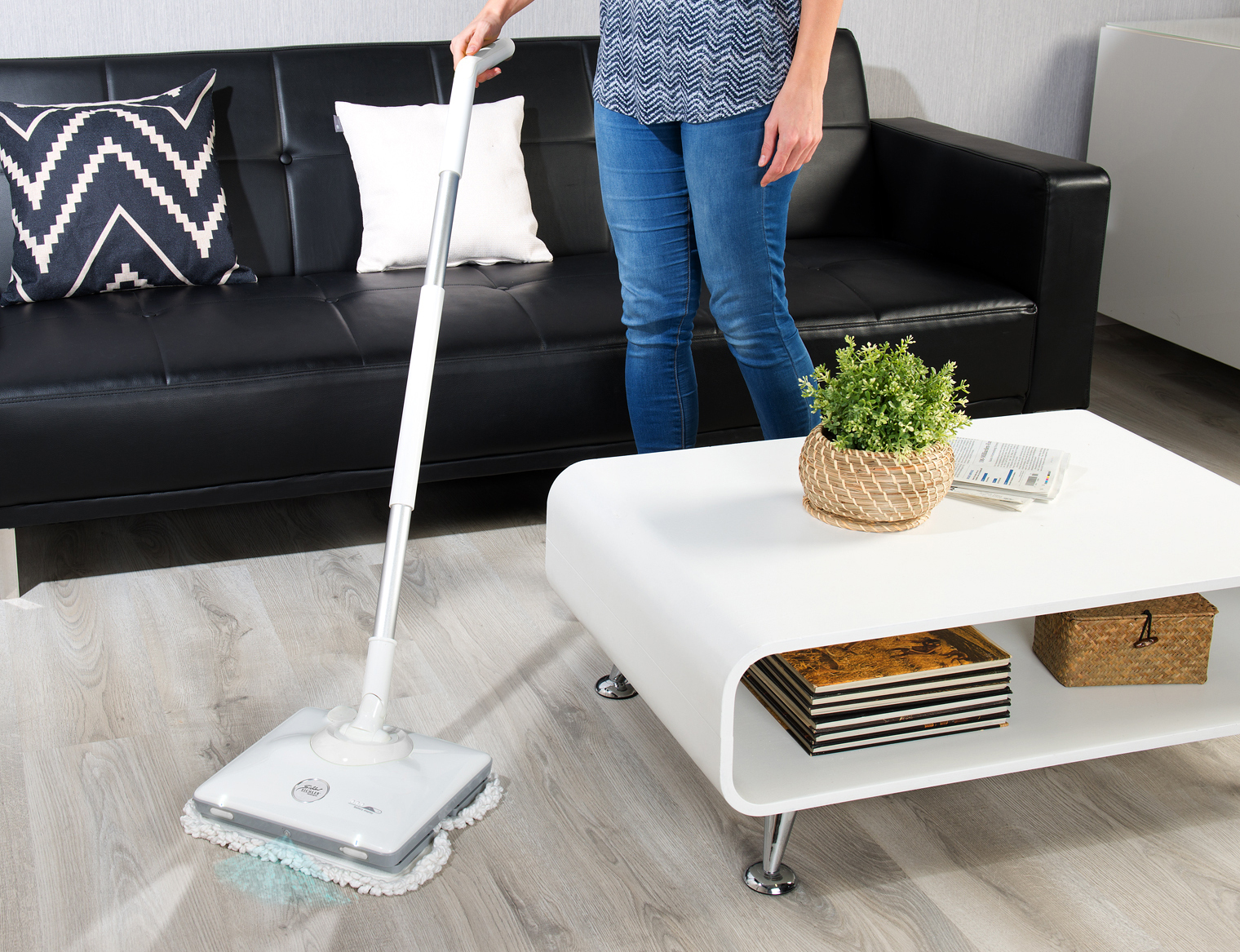 Die Sichler Fußboden-Poliermaschine FPM-900 spart Zeit und Mühe: Der Kopf der Poliermaschine schwingt 900-mal pro Minute. Zusammen mit der Sprüh-Funktion reinigt der Haushaltshelfer so glatte Böden – ob Fliesen, Stein, Laminat oder Parkett.