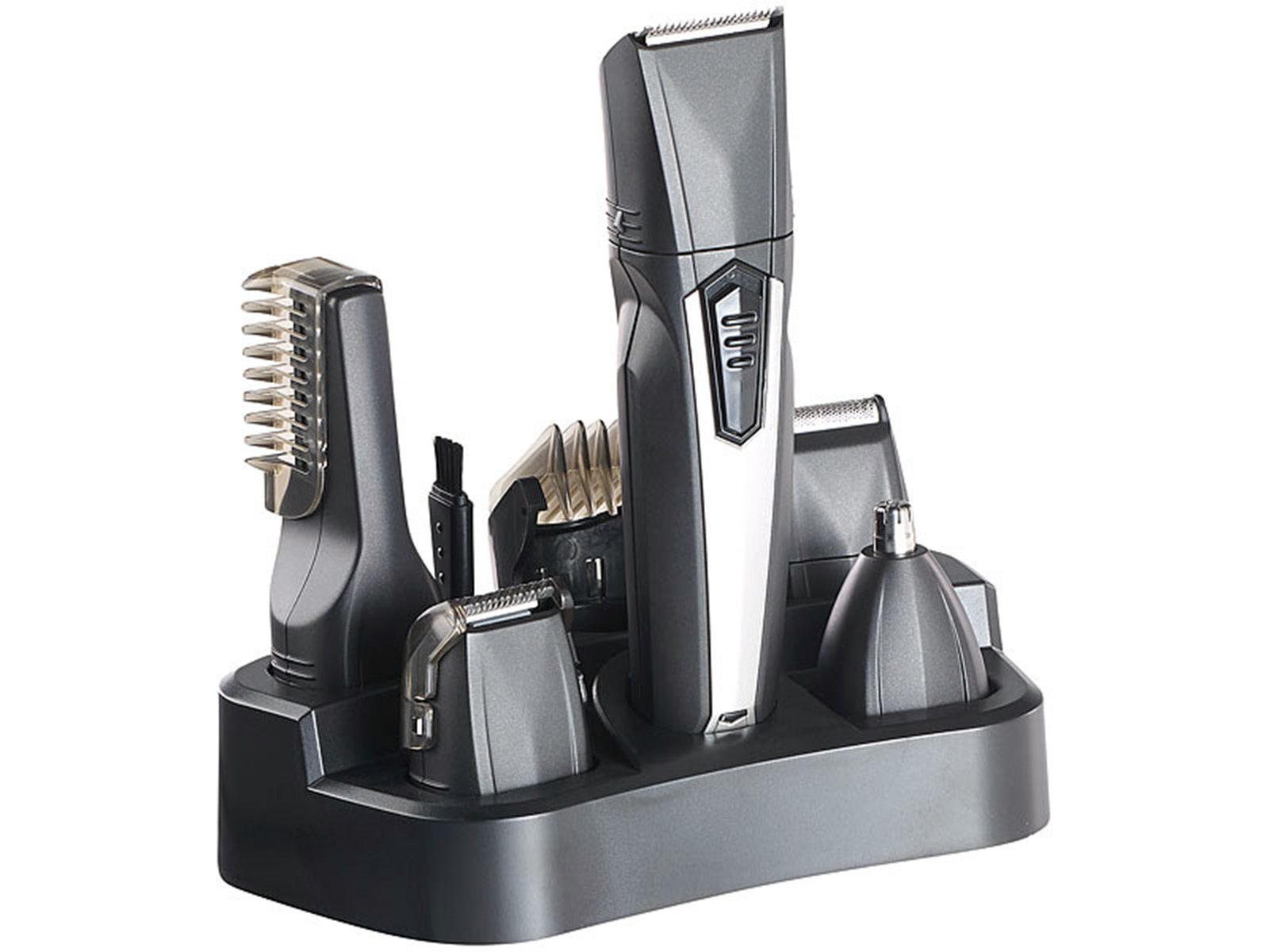 - 6 Scherköpfe: Haar-Trimmer (breit), Präzisions-Trimmer (schmal), Konturen-Trimmer, Fein-Rasierer, Nasen-/Ohrhaar-Trimmer, Körperhaar-Rasierer