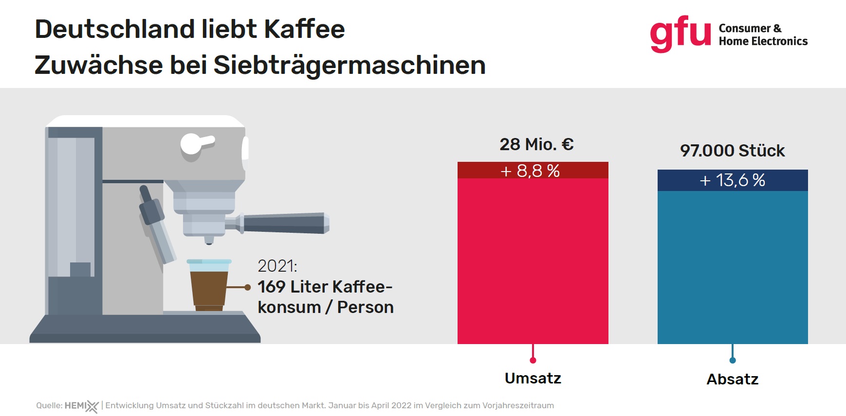 Obwohl Filterkaffee die in Deutschland beliebteste Zubereitungsart ist, ist eine Geräte-Gattung zur Zubereitung aktuell besonders erfolgreich: Espresso aus der Espresso-Siebträger-Maschine. In den ersten vier Monaten des Jahres 2022 wurden bereits über 97.000 Espresso-Siebträger-Maschinen in Deutschland verkauft – ein Plus von 13,6%. Auch beim Umsatz konnten die Siebträger zulegen. Zwischen Januar und April 2022 wurde ein Umsatzvolumen von mehr als 28 Millionen Euro erzielt, ein Zuwachs um 8,8%.