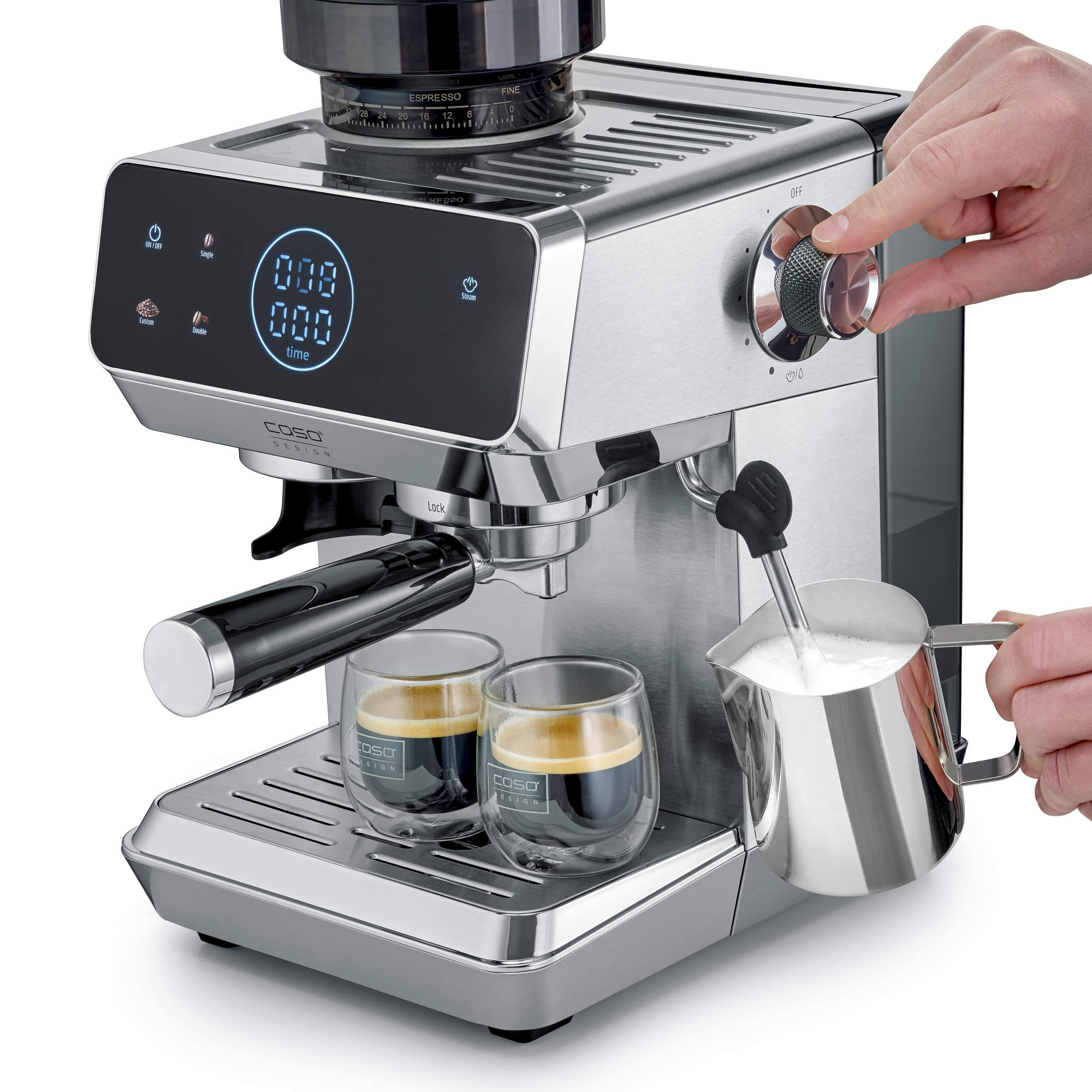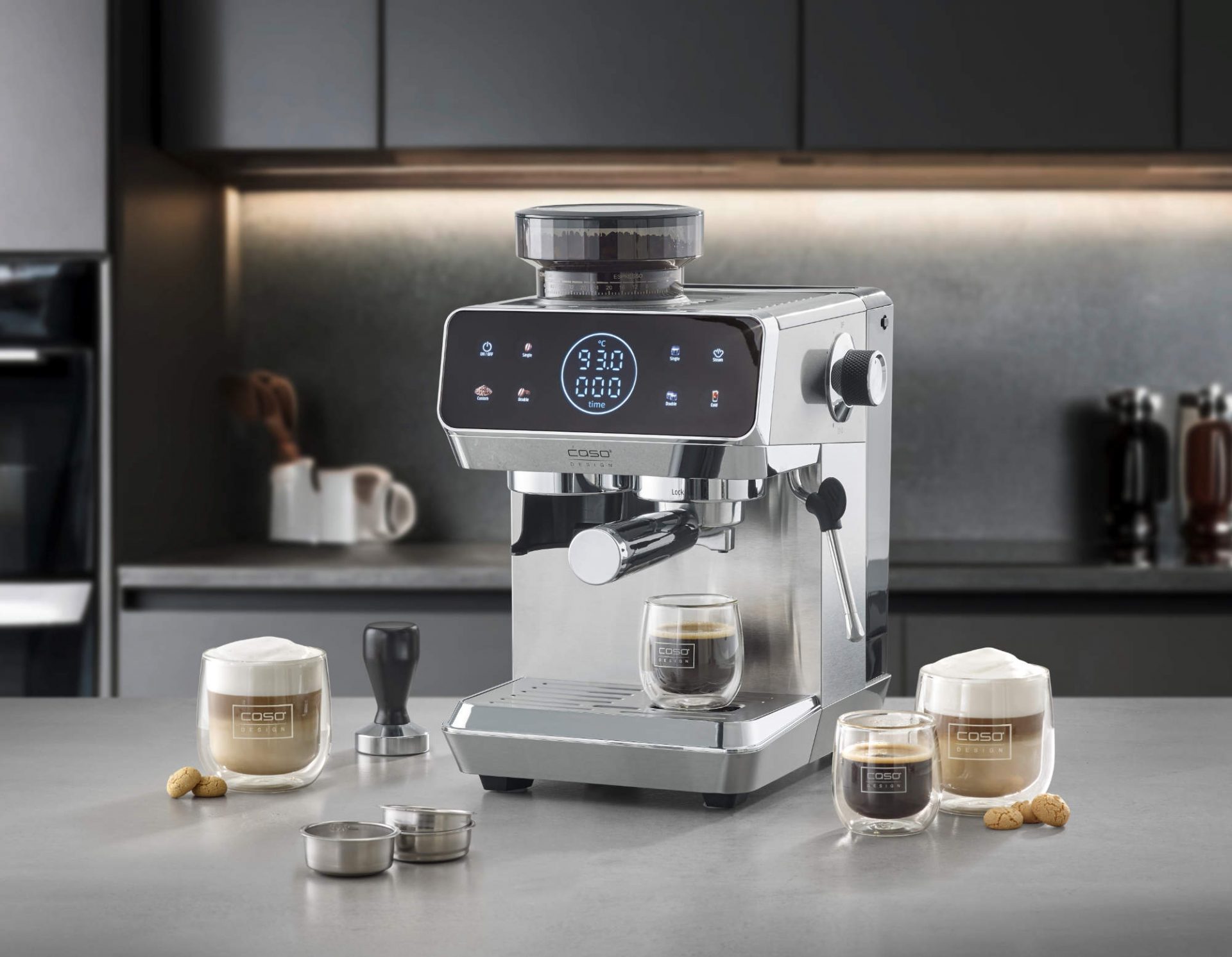 Dank des sicheren Thermoblock-Heizsystems ist die EspressoGourmet & Grind schnell einsatzbereit, die Bedienung erfolgt ganz einfach per Sensor-Touch über das ansprechende Farbdisplay. Die übersichtliche Anzeige informiert über Temperatur, Brüh- und Mahldauer des gewünschten Espressos. Zum umfangreichen Zubehör der hochwertigen Design Siebträgermaschine gehören unter anderem zwei einwandige sowie zwei zweiwandige Edelstahl-Filtereinsätze (jeweils für 1 oder 2 Tassen) – CASO Crema-Garantie inklusive! – sowie ein extra schwerer Metalltamper.
