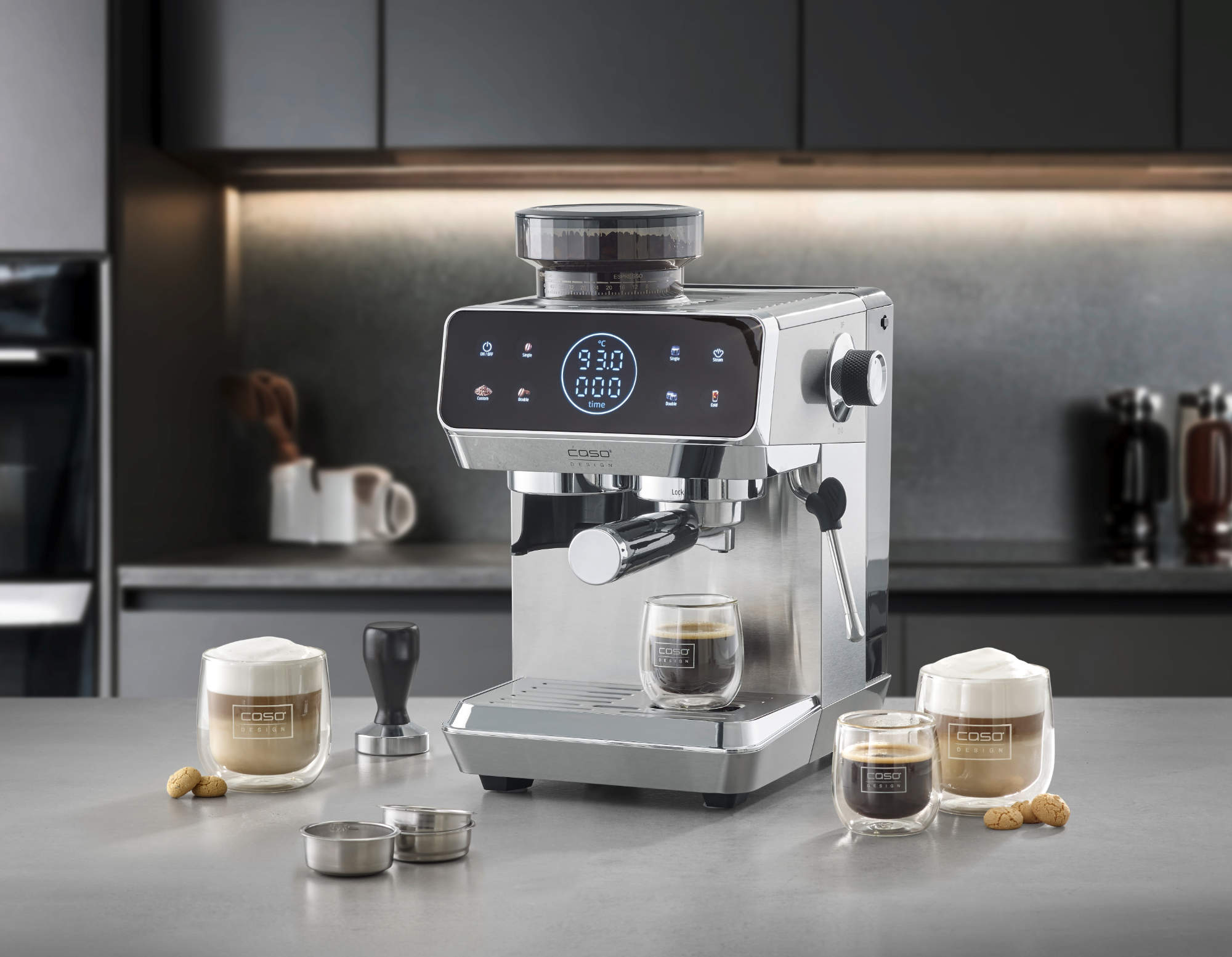 Die Siebträgermaschine EspressoGourmet & Grind von CASO Design kombiniert integriertes Edelstahl-Kegelmahlwerk mit direkter Mahlung in den Siebträger und ermöglicht so eine aromaschützende, frische Espressozubereitung.
