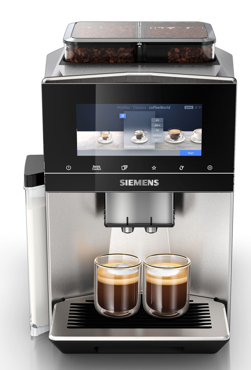 Alle Parameter und Einstellungen werden über das 6,8 Zoll große iSelect Display vorgenommen. Die Bedienung geschieht intuitiv per Touch-and-Slide im übersichtlich gestalteten Menü. Dort findet sich auch die Siemens coffeeWorld. Zusätzlich zu den bis zu 9 klassischen Getränken, bietet diese Kaffeetrinkenden die Auswahl aus bis zu 10 Spezialitäten aus acht verschiedenen Ländern und bei Bedienung per App sogar bis zu 21 länderspezifische Getränke.