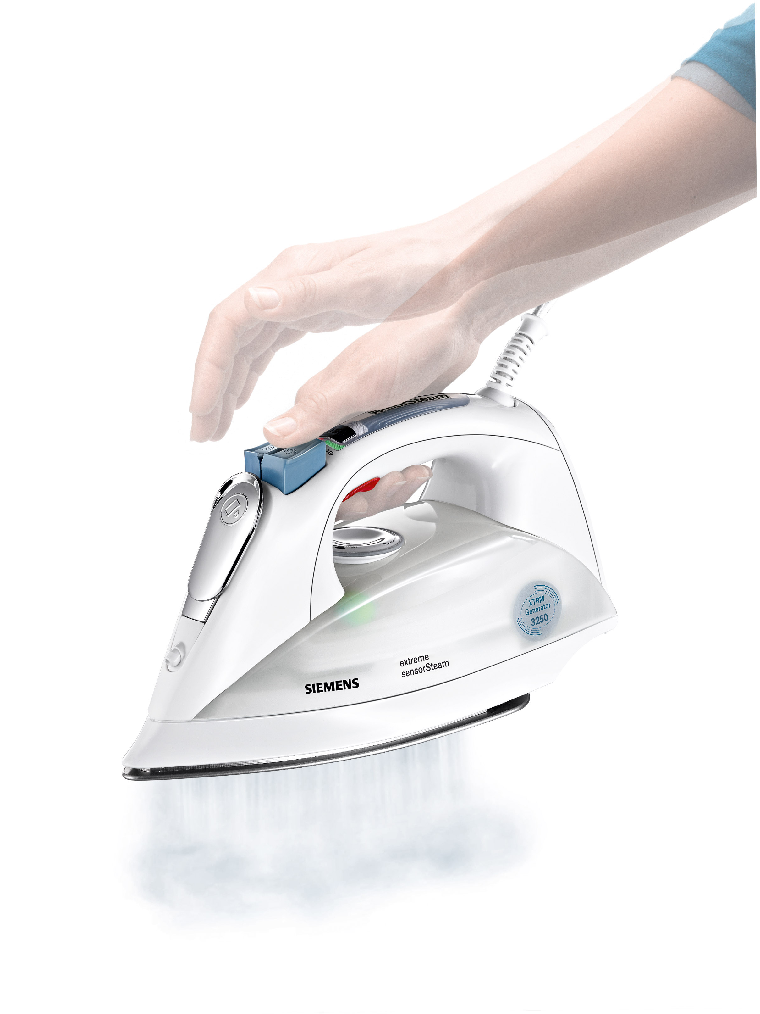 Beim neuen Siemens TS12 Kompakt-Dampfgenerator ist Hitze oder keine Hitze, Dampf oder kein Dampf eine Frage der Berührung. In seinem Griff ist die so genannte activeControl Plus Sensorik verborgen. Diese stoppt sofort den Dampf und die Stromzufuhr, sobald sich die Hand vom Griff löst – wenn zum Beispiel gerade das Telefon klingelt oder der Briefträger an der Tür ist. Das Bügeleisen schaltet sich automatisch aus. Und das alles, ohne dass die oder der Bügelnde daran denken muss.