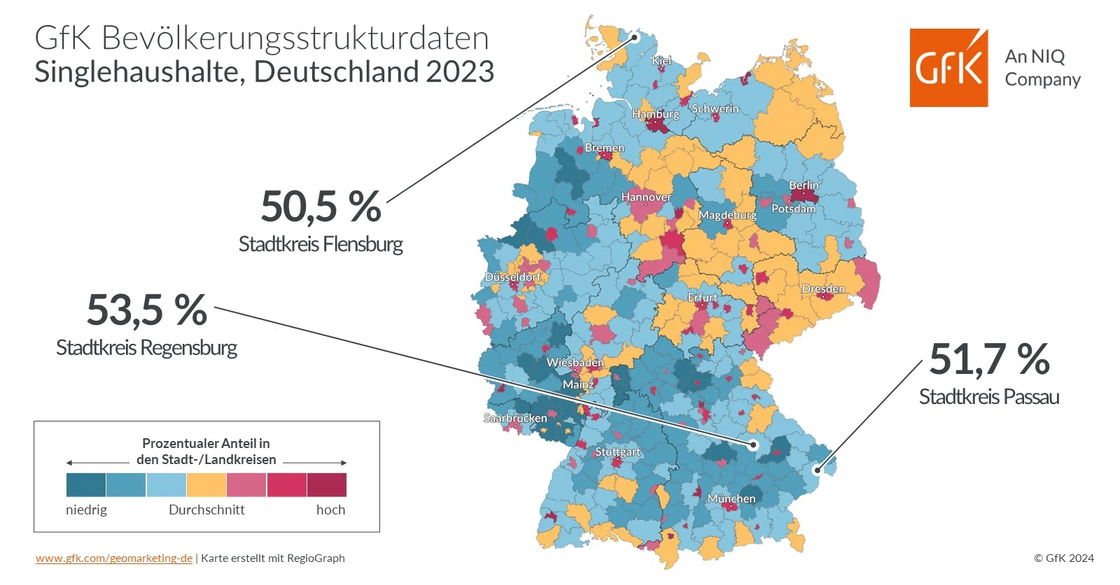 Die aktuellen GfK Daten zur Bevölkerungsstruktur zeigen, dass im Stadtkreis Regensburg mit einem Anteil von 53,5% mehr als jeder Zweite allein lebt. Damit liegt die oberpfälzische Großstadt knapp 31% über dem Bundesdurchschnitt und auf dem ersten Platz aller Stadt- und Landkreise. Auf den Rängen zwei und drei folgen die Stadtkreise Passau (51,7%) und Flensburg (50,5%). Prozentual die wenigsten Einpersonenhaushalte gibt es hingegen im Landkreis Cloppenburg, wo lediglich 29,2% aller Haushalte von nur einer Person bewohnt werden.