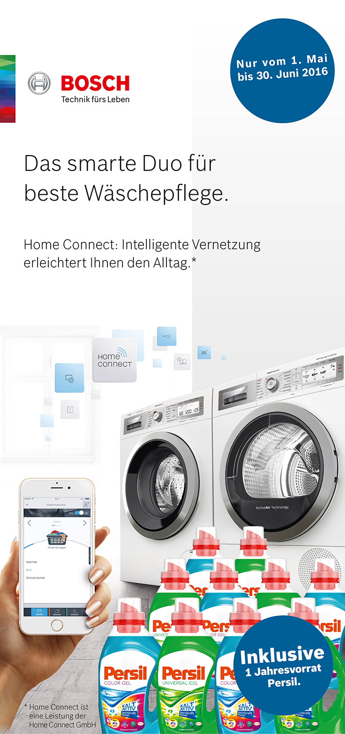 Zwei Wäschepflege-Profis bündeln erneut ihre Power: In Kooperation mit seinem langjährigen Partner Persil unterstützt Bosch seit dem 1. Mai bis 30. Juni 2016 den Elektrofachhandel mit einer attraktiven Zugabe-Aktion. Unter dem Motto „Das smarte Duo für beste Wäschepflege“ erhalten Kunden beim Kauf eines HomeProfessional Home Connect Gerätes oder eines Serie 8 Home Connect Gerätes von Bosch im Aktionszeitraum einen Jahresvorrat von jeweils fünf Flaschen Persil Universal- und Colorwaschmittel gratis. Wer sich in dieser Zeit entscheidet, wäscht ein Jahr lang nicht nur mit allen Vorteilen der intelligenten Vernetzung, sondern dank der Waschmittelmarke Nr. 1 in Deutschland auch strahlend rein. Mit der aktuellen Aktion knüpft Bosch an den großen Erfolg einer Vorgängerkampagne von 2014 an.