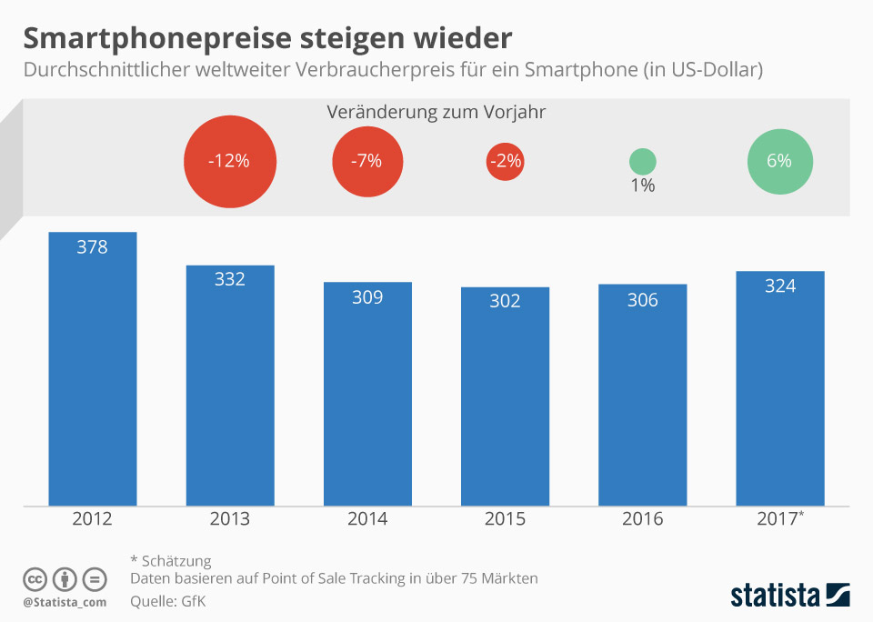 Der durchschnittliche weltweite Verkaufspreis von Smartphones steigt. Kostete ein Gerät 2012 noch 378 US-Dollar, waren es 2015 nur mehr 302 US-Dollar. Im Vergleich dazu zieht der Preis nun wieder deutlich an und liegt nach Schätzung der GfK in diesem Jahr bei 324 US-Dollar.