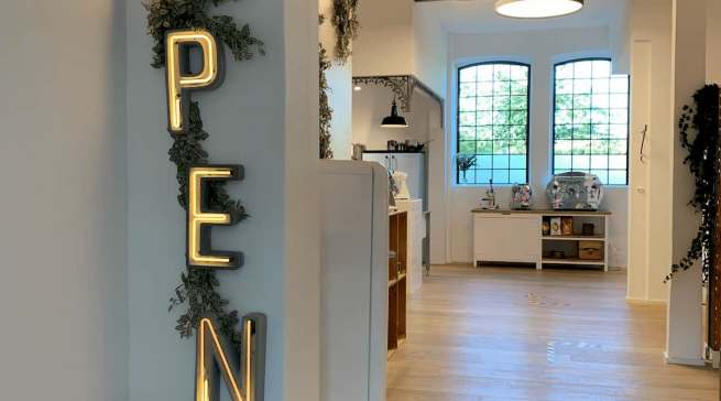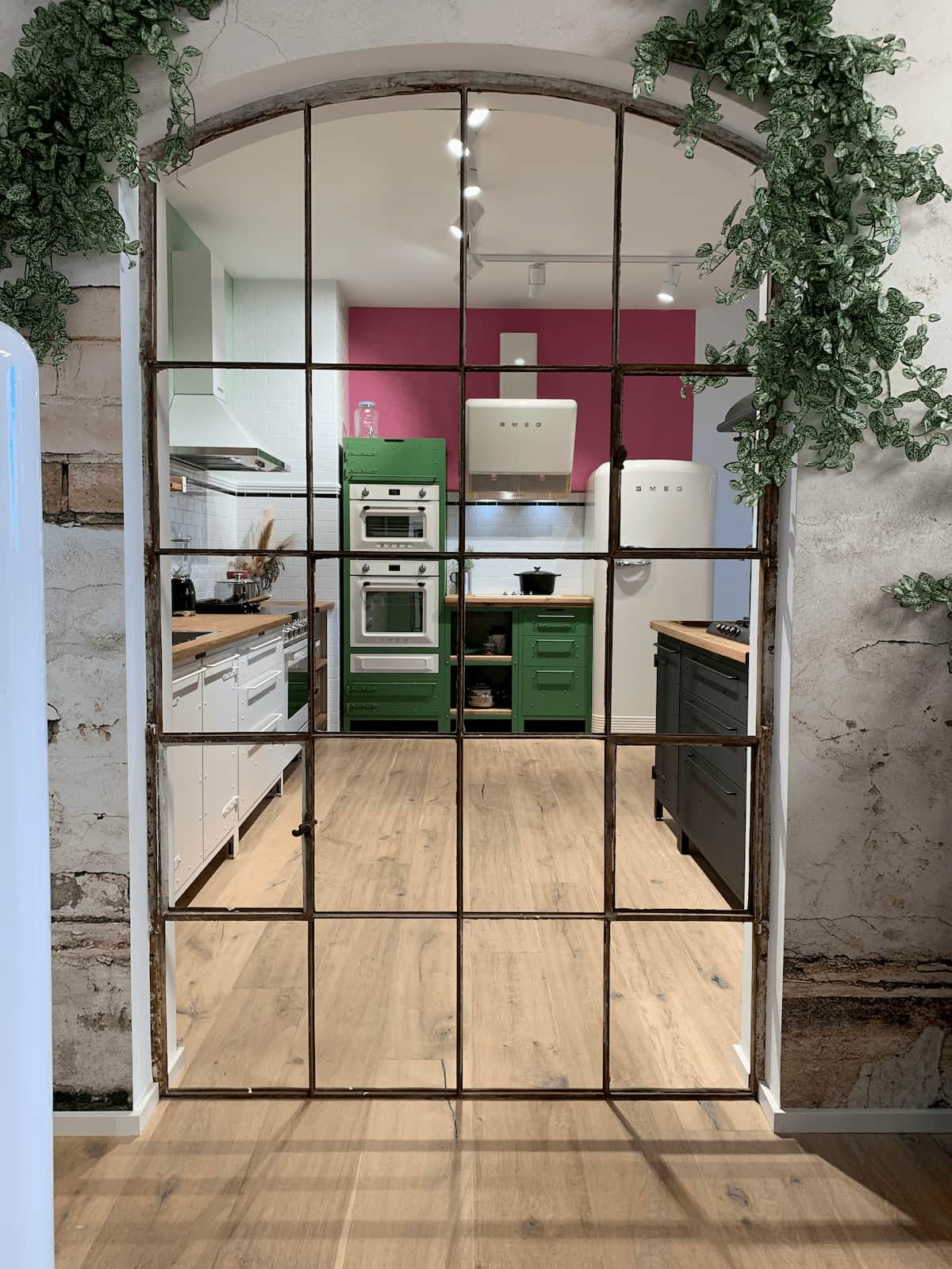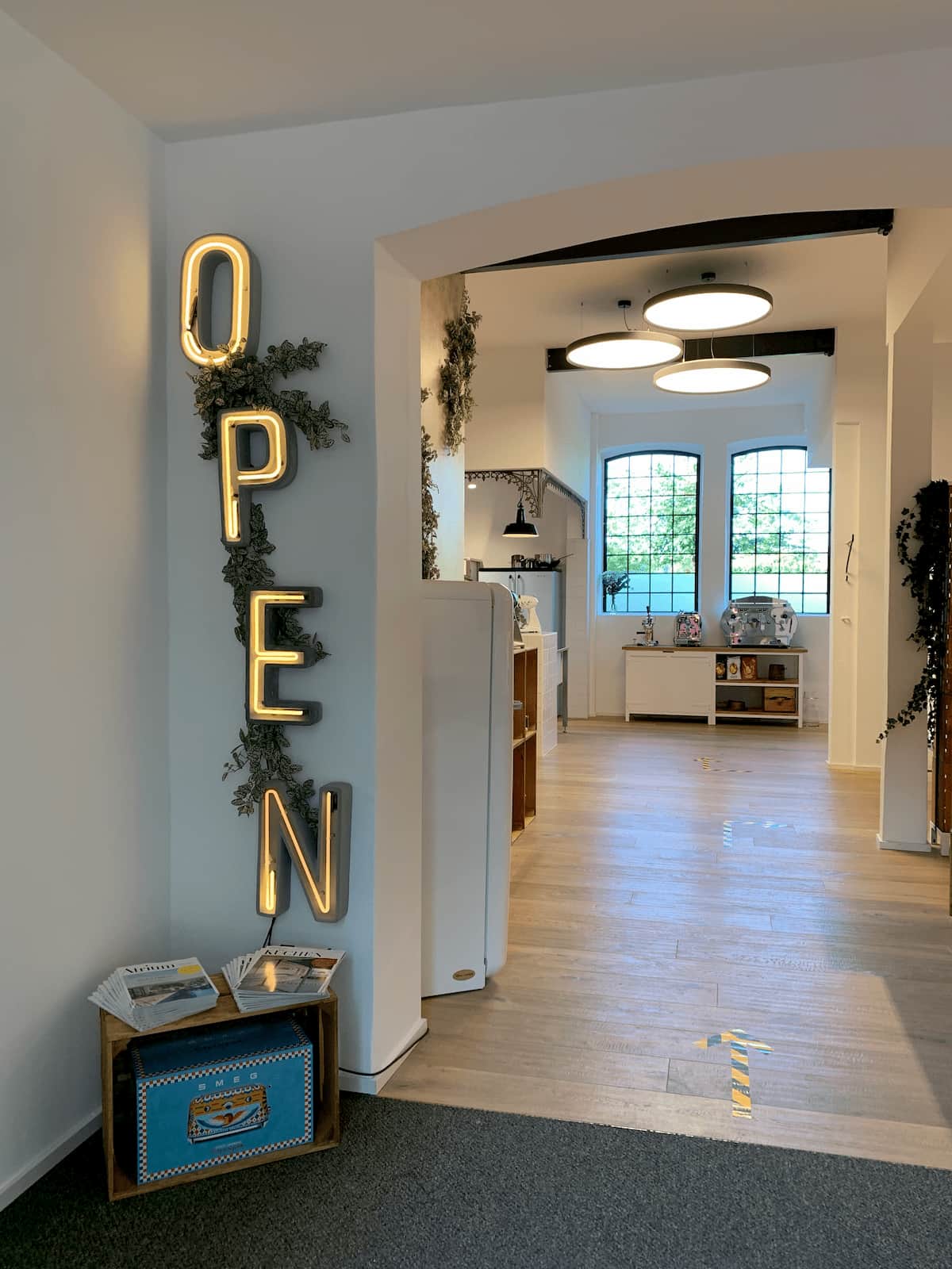 Gut Böckel anno 2020. Ein Kühlschrank weist den Weg zu Smeg als einzigem Aussteller vor Ort in diesem Jahr. Geöffnet: Ausstellung von Smeg auf Gut Böckel. Zeitlos betörender Hingucker: Die Kollektionen von Dolce & Gabbana. Smeg präsentierte im neugestalteten Showroom seine Highlights. Die Berliner Stahlmöbel-Manufaktur Noodles Noodles & Noodles Corp. zeigte erstmals eine Lösung für vollintegrierte Geschirrspüler.
