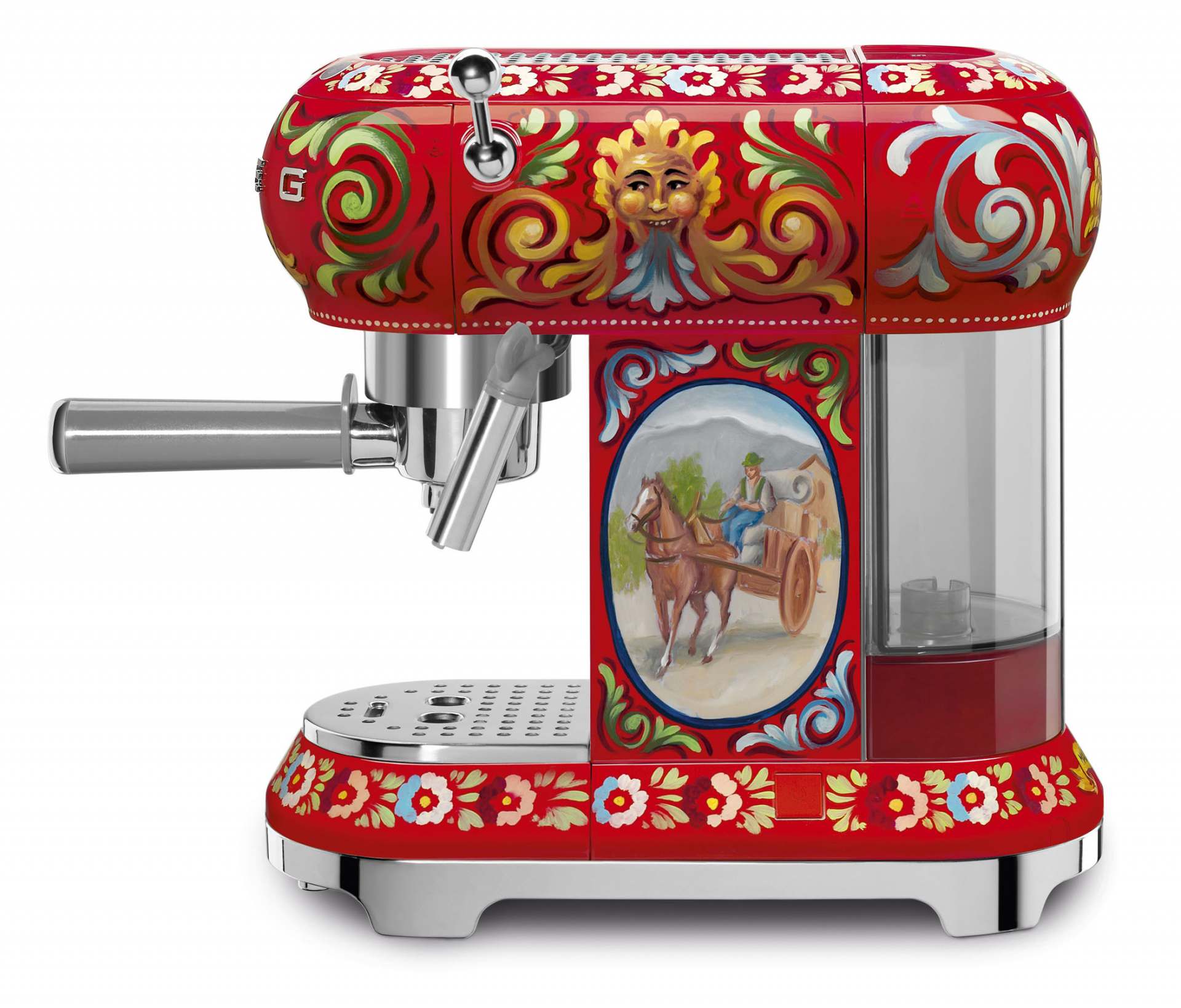Dolce & Gabbana hat sich für dieses Design von Mythologie und Alltagsleben der Mittelmeerinsel inspirieren lassen, insbesondere von den traditionellen, sizilianischen Pferdekarren. Voller Lebensfreude umranken üppige Blätter und Blüten einen barocken Wasserspeier – und in der Mitte schmückt eine Kamee mit einem kunstvollen Karrenmotiv die Espressomaschine, umrahmt von elegant geschwungenen Akanthusblättern.