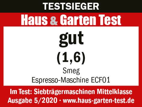 Das Magazin „Haus & Garten Test“ hat in seinem Heft 5/2020 zehn Espressomaschinen getestet. Die Smeg Espresso- Kaffeemaschine ging als Testsiegerin ihrer Klasse hervor. Ihren Spitzenplatz mit der Gesamtnote 1,6 errang sie vor allem durch hervorragende Bewertungen in der Kategorie Funktion.