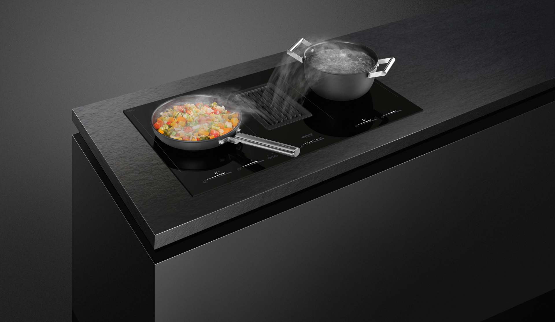 Durch sein neutrales Design passt das Kochfeld mit integriertem Abzug zu sämtlichen Designlinien von Smeg. Dank C-Schliff ist es sowohl aufgesetzt als auch flächenbündig in der Arbeitsplatte integrierbar.