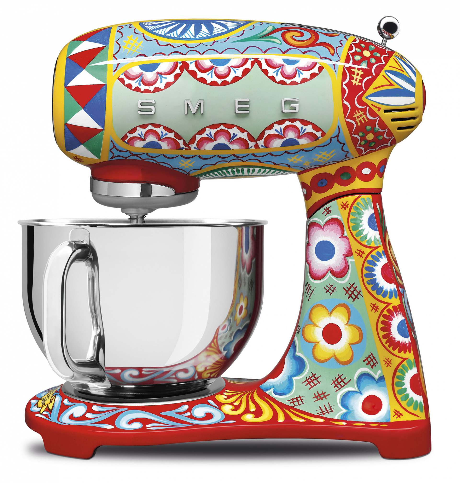 Die Smeg Küchenmaschine Dolce & Gabbana ist ein Gerät aus der Serie „Sicily is my love“ mit strahlendem Muster und leuchtenden Farben des italienischen Südens. Das Blau des sizilianischen Himmels, das intensive Rot süßer Kirschen und das Grün üppiger Kakteen sind eine einzige, große Liebeserklärung an alles Gute und Besondere.