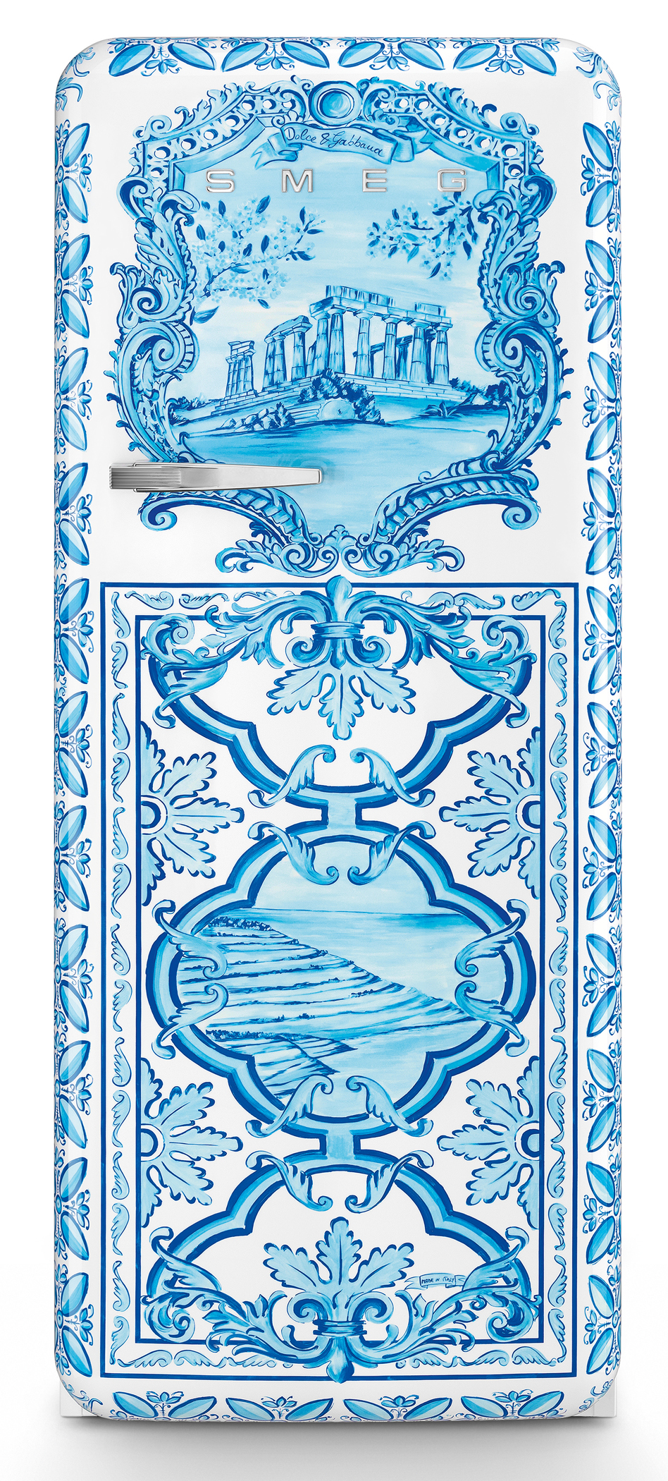 Der Smeg Kühlschrank Dolce & Gabbana mit Majolika-Motiven ist im Stil der 50-iger Jahre gefertigt. Das Design mit Majolika, leuchtend bemalten Keramikgefäßen und Kacheln erinnern an Sizilien. Auf der Kühlschranktür zieht die Zeichnung eines griechischen Tempels den Blick auf sich. Die kunstvolle Arbeit im Majolika-Stil ist umrahmt von stilisierten Lilien. Die linke Seite des Geräts schmücken eine fein ausgearbeitete Küstenlandschaft und die für Sizilien so typischen Akanthusblätter. Auf der rechten Seite schlägt ein Blick auf den Geburtsort des berühmten Schriftstellers Luigi Pirandello eine Brücke in die Neuzeit.