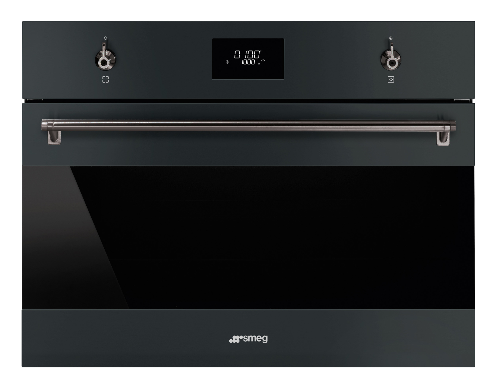 Die Smeg Mikrowelle Classici ist ein 45 cm breites Einbaugerät in mattschwarzer Optik.