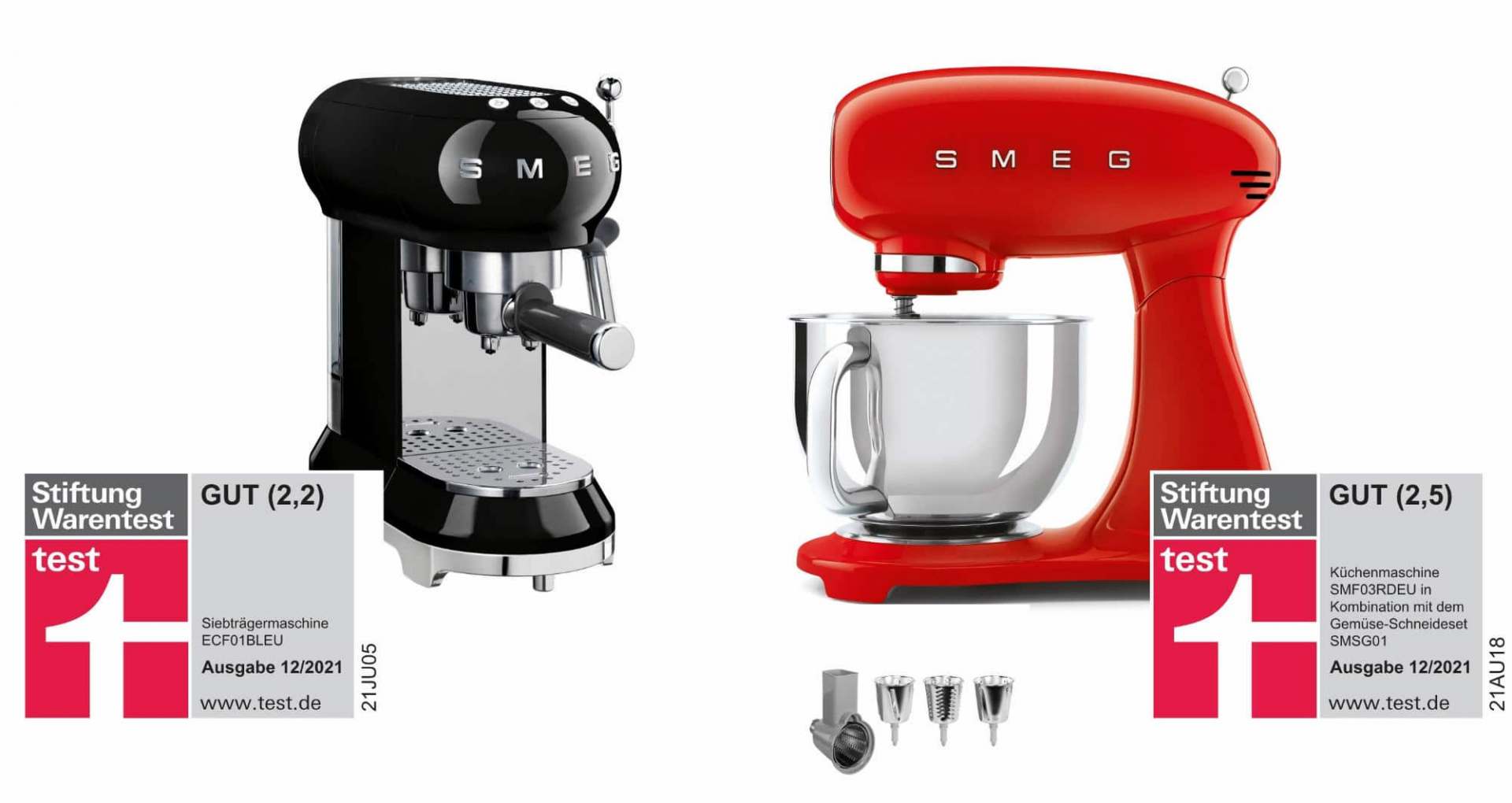 Für den Siebträger von Smeg kommen die Tester zu diesem Fazit: „Die Smeg im Retro-Design überzeugt in der Handhabung und bereitet besonders schmackhaften Espresso zu.“ Das Qualitätsurteil „gut“ (2,2) gilt für alle baugleichen Geräte der Serie ECF01.