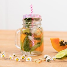 1,5 Liter mit Magnesium mineralisiertes, gefiltertes Leitungswasser mit Hilfe des BWT Magnesium Mineralizers zubereiten. Rhabarber in kleine Stücke schneiden. Papaya schälen, Kerne entfernen und in Spalten schneiden. Minze und Gänseblümchen gut waschen und verlesen. Die Limette in Spalten schneiden. Alle Zutaten in einen Krug geben um mit kaltem, mit Magnesium mineralisierten, gefiltertem Wasser aufgießen. Mindestens eine Stunde stehen lassen.