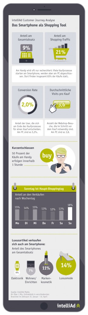 „Smartphones dienen den Online-Surfern überwiegend als Informationsquelle. Wenn mobil gekauft wird, dann sehr schnell. Doch die allermeisten Onlinekäufe, die am Smartphone starten, werden am Desktop abgeschlossen. Dort finden 83 Prozent der Conversions statt, obwohl der Trafficanteil nur bei 70 Prozent liegt“. Dies sind Erkenntnisse aus einer Studie des Münchener Technologieunternehmens IntelliAD Media. Ausgewertet wurden über eine Million Onlinekäufe in zehn Branchen.