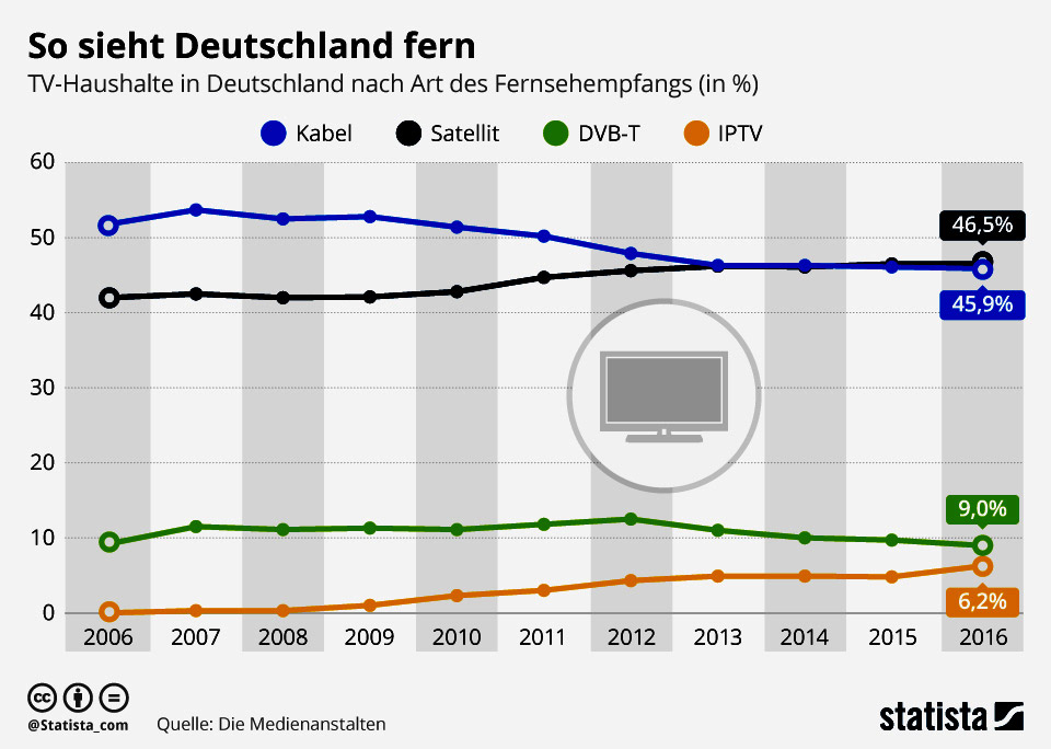 Ferner wird das künftig unter dem Titel Freenet-TV firmierende Antennenfernsehen ab Juli 2017 monatlich 5,75 EUR kosten. Ob sich der Abwärtstrend dieses Übertragungsweges so stoppen lassen wird, scheint zumindest fraglich. Aktuell bekommt das Gros der Fernseh-Haushalte sein Programm über Kabel (45,9 %) und Satellit (46,5 %). Weitere 2,4 Mio. Haushalte sehen via IPTV fern.