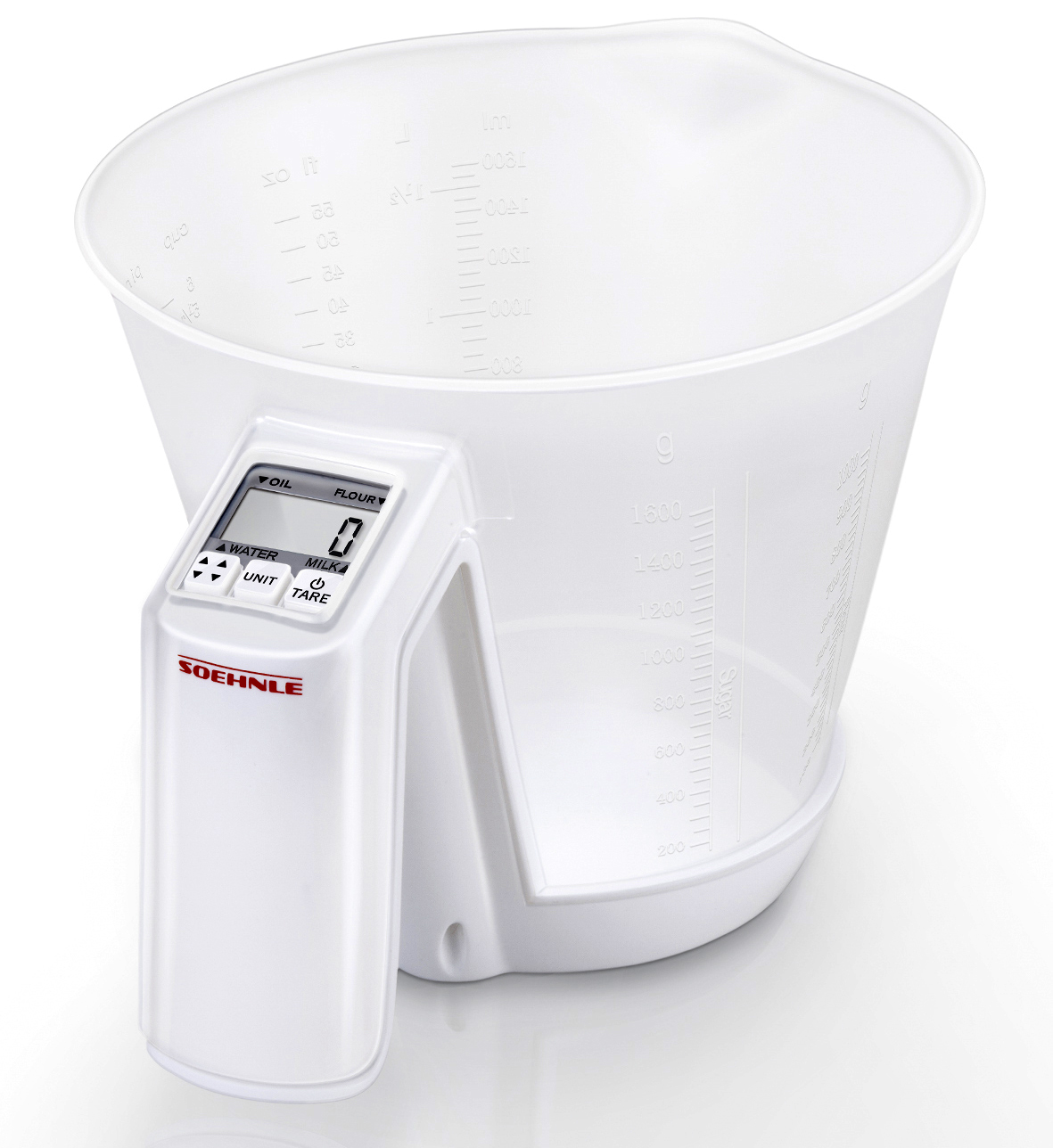 Mit einem Knopfdruck schaltet die Waage in den jeweiligen Modus um, auch mit praktischer Zuwiegefunktion. Die Rührschüssel bietet ein Fassungsvolumen von 1,5 Liter. Dank sieben verschiedener aufgedruckter Skalen kann sie separat als Messbecher verwendet werden. Nach Gebrauch lässt sich die Schüssel bequem abnehmen und in der Spülmaschine reinigen.