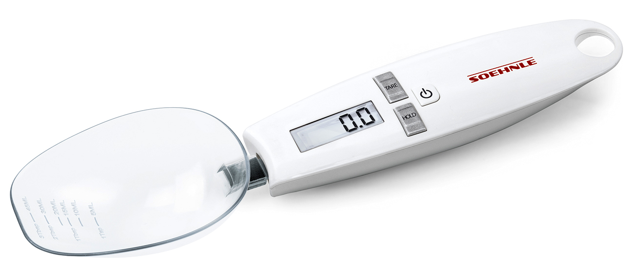 Die Hold-Funktion zeigt das Gewicht auf der LCD-Anzeige an. Der Löffel ist abnehmbar und kann in der Spülmaschine gereinigt werden. Mit komfortabler Abschaltautomatik und Zuwiegefunktion.