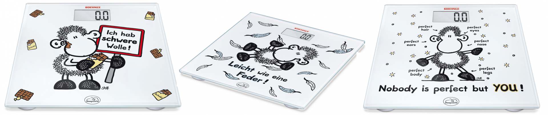 Die Waage ist mit drei flotten Sprüchen erhältlich: „Ich habe schwere Wolle!“, „Leicht wie eine Feder!“ und „Nobody is perfect but you!“.
