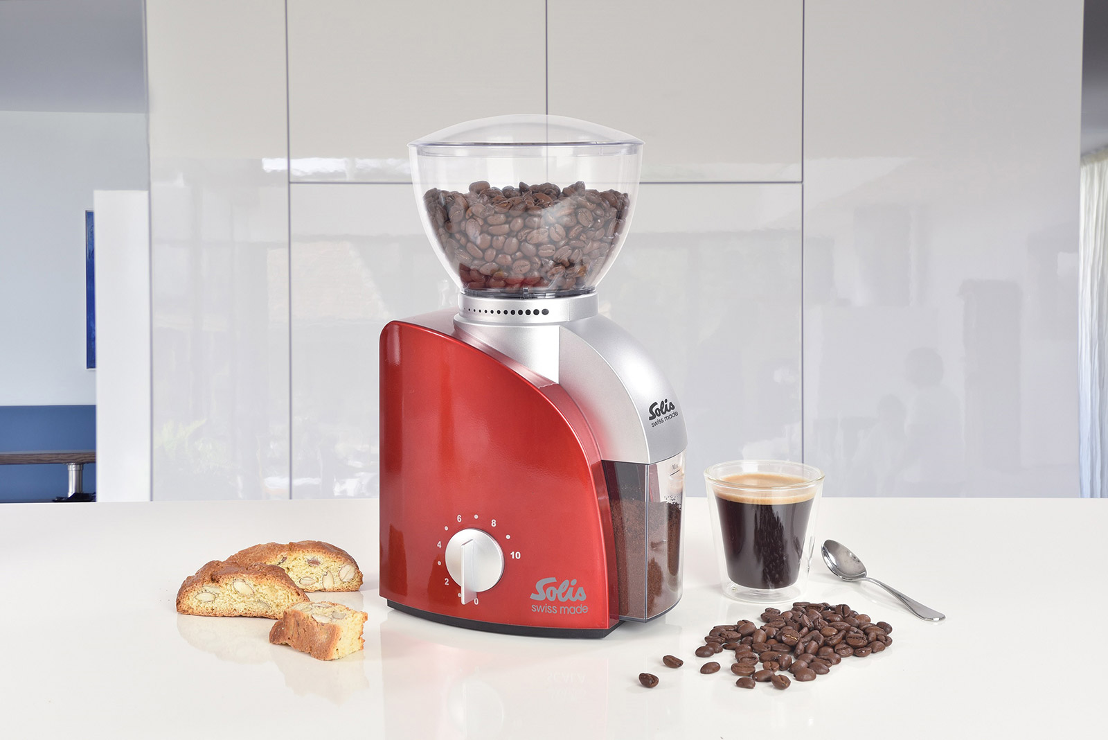 Die Scala Kaffeemühle wird von Solis in der Schweiz hergestellt und ist in zwei attraktiven Farben erhältlich: Silver Dust und Red Temptation.
