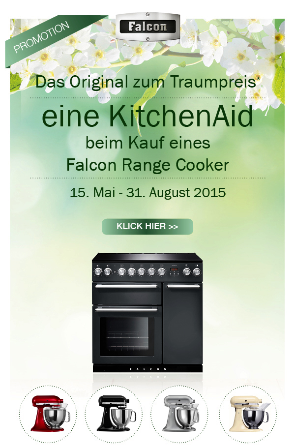 Beim Kauf eines Falcon Range Cooker erhält der Kunde eine KitchenAid Artisan, ein Klassiker unter den Küchenmaschinen, zu einem Spezialpreis. Die Konditionen: Bei einem Falcon Verkaufsaufpreis von bis zu 4.349 EUR zahlt der Kunde 199 EUR zu. Bei einem Verkaufspreis ab 4.395 EUR zahlt er nur noch 19 EUR für die KitchenAid, die regulär für rund 650 EUR im Handel kostet. Dabei hat der Kunde die frei Wahl unter neun Farben – von Empire Red über Imperial Black bis zu Medaillon Silver.