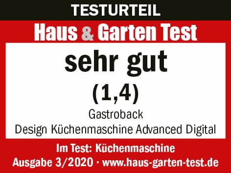 Im Verbrauchermagazin Haus & Garten Test (03/2020) ist die Gastroback Küchenmaschine Advanced Digital als „Sorglospaket mit vielen Extras“ und der Bestnote 1,4 (sehr gut) bewertet worden.