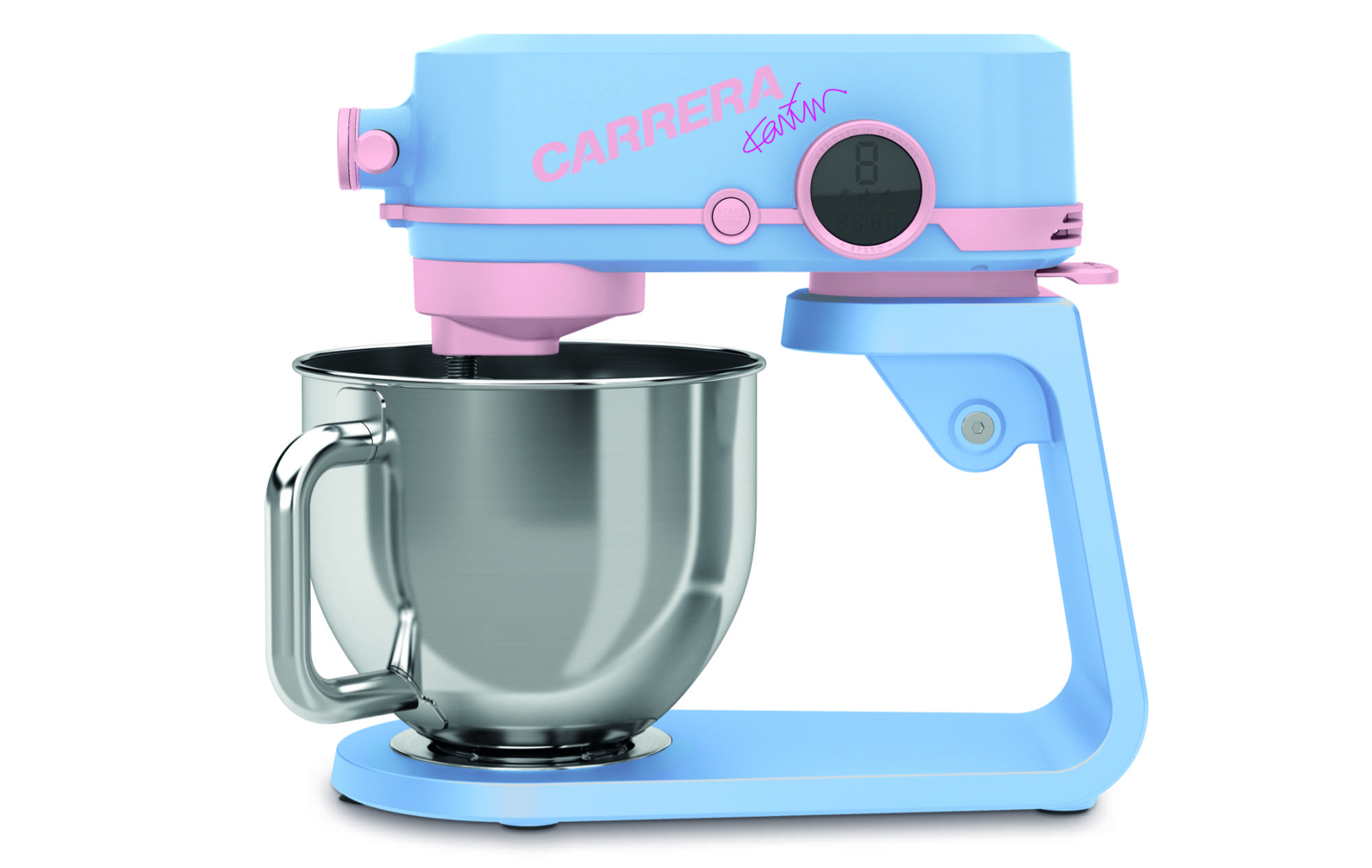 Carrera und der Designer Karim Rashid überraschen mit einer Küchenmaschine in der Farbkombination himmelblau und rosa.