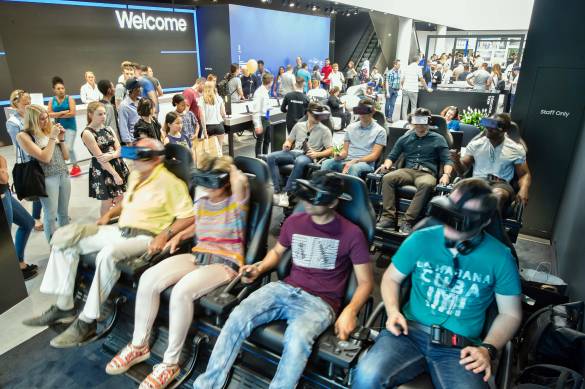 Mit dem neu gestalteten Flagship Store feiert Samsung die Kreativität im Bereich Technik und gibt Konsumenten die Möglichkeit, Produkte vor Ort auszuprobieren und interagieren zu lassen. Bereits beim Betreten des Samsung Showcase tauchen die Konsumenten gleich rechts in die Samsung Welt ein, wenn sie am Eingang das beeindruckende VR-Theater und die Videowall passieren. Tribünen mit großen Bildschirmen laden zu Public Viewing-Events ein und bieten Platz für tägliche Events wie Mal- und Coding-Stunden für Kinder. Darüber hinaus geben Virtual-Reality-Stationen Konsumenten die Möglichkeit, in virtuelle Welten abzutauchen.