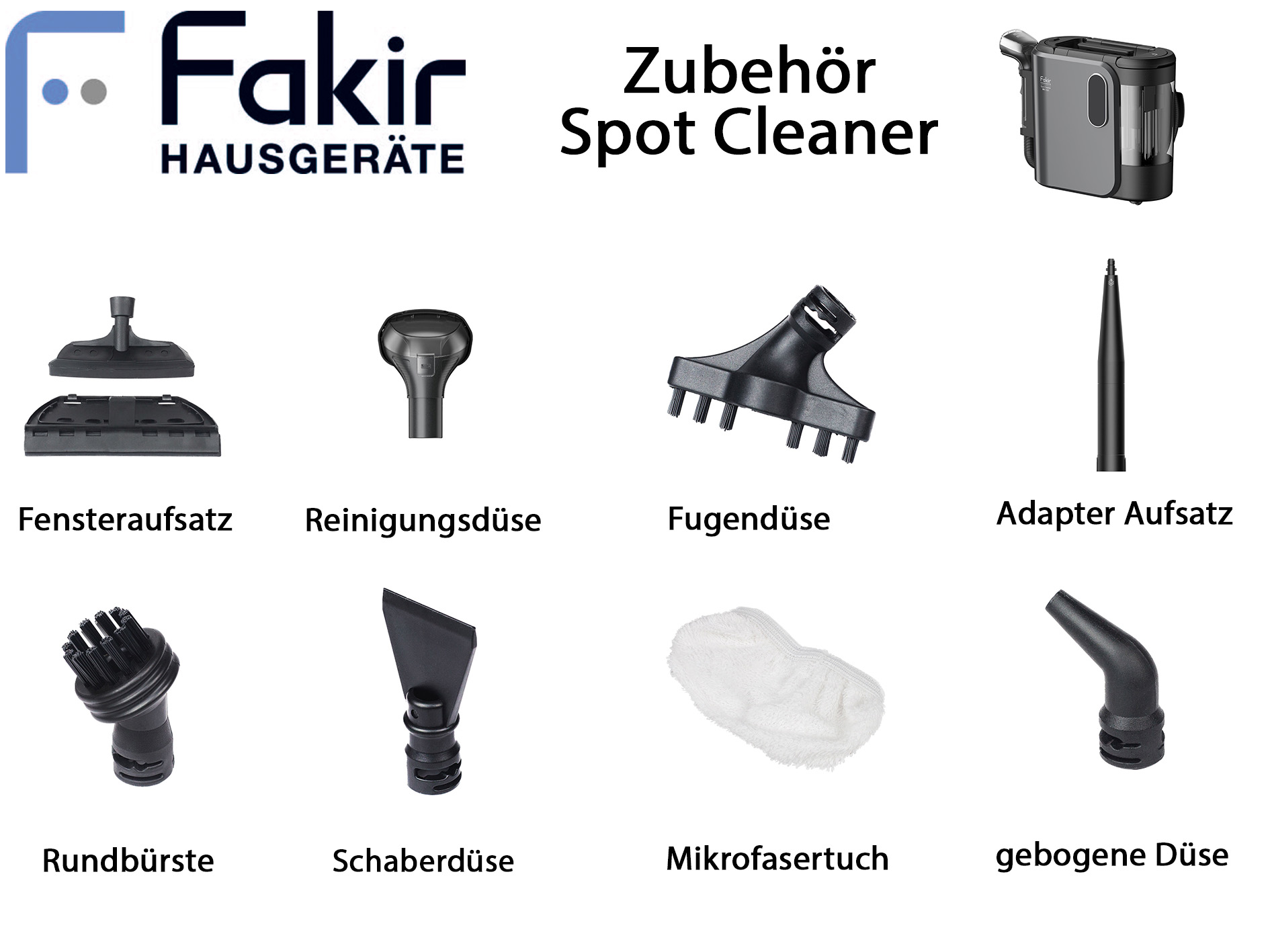 Der Multifunktionale Dampf- und Fleckenreiniger Fakir Spot Cleaner PR 7020 übernimmt mit insgesamt 4 Reinigungsmodi, die professionelle Tiefenreinigung für Ihre Teppiche, Sofas, Polstermöbel und Fahrzeugsitze ganz ohne Chemie.