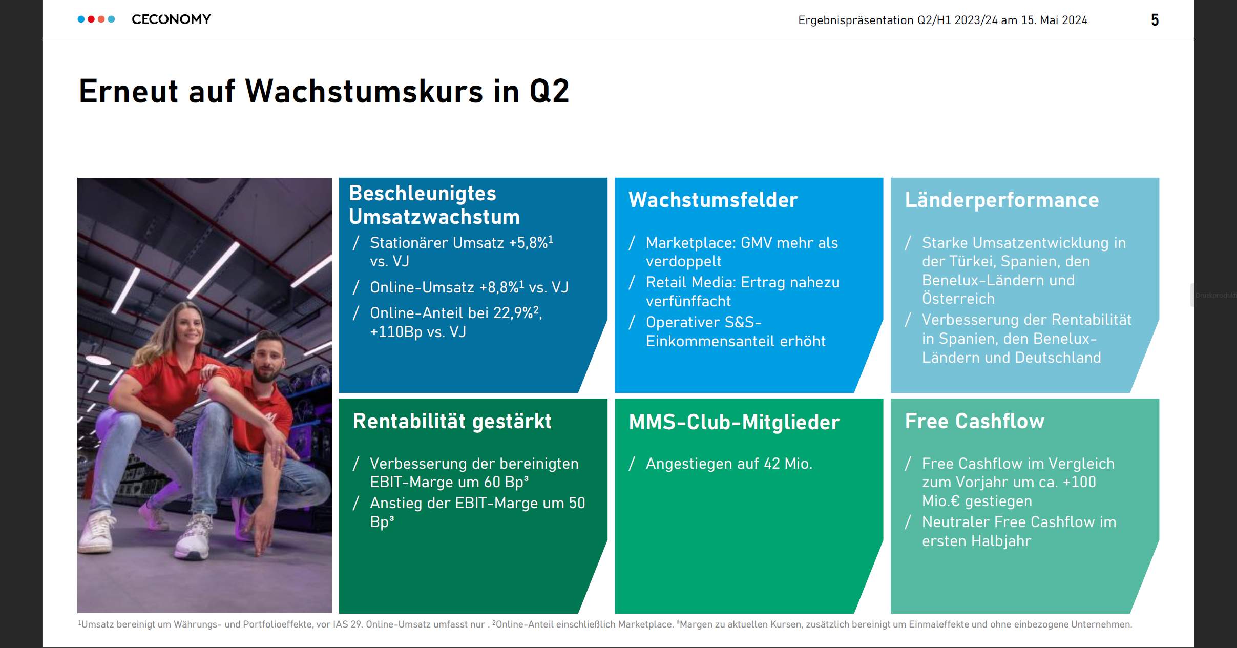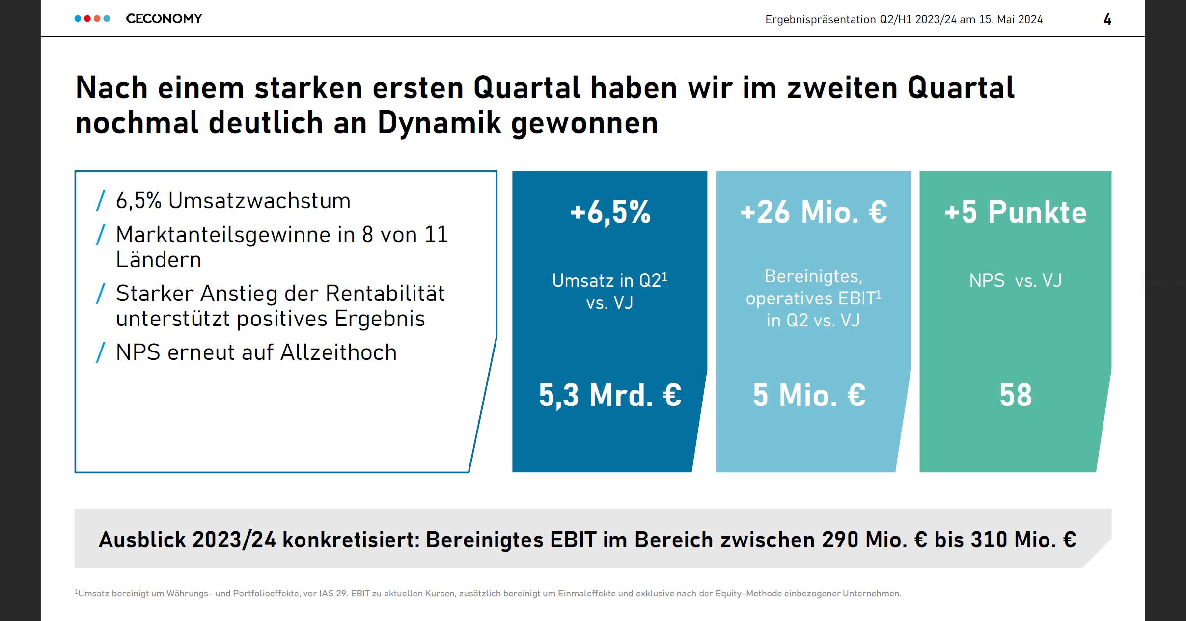 Konkret: Die Ceconomy AG hat im 2. Quartal 2023/24 seinen Umsatz um 6,5% auf 5,3 Mrd. EUR gesteigert. Das Unternehmen erzielte in allen Regionen eine Trendverbesserung gegenüber dem 1. Quartal und erreichte sowohl im stationären Geschäft als auch online ein Wachstum. Auf Halbjahressicht hat das Unternehmen den Umsatz im Vergleich zum Vorjahreszeitraum um 4,8% auf 12,3 Mrd. erhöht.
