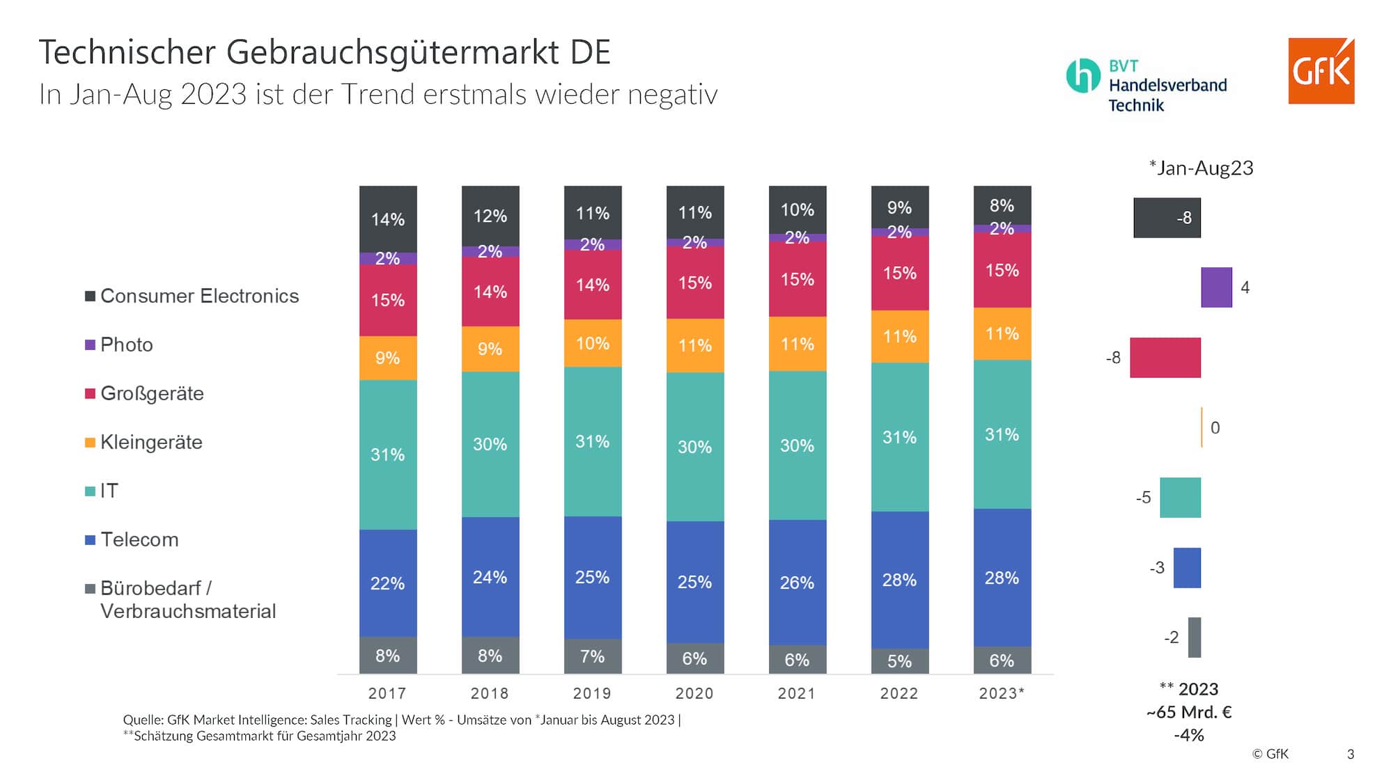 Der Handelsverband Technik (BVT) und die Marktforscher der GfK berichteten anlässlich ihrer Jahreswirtschafts-Pressekonferenz am 8. November in Köln über die Marktentwicklung in der Branche: So werden in Deutschland in diesem Jahr voraussichtlich 65 Mrd. EUR (2022: 68 Mrd. EUR) für technische Gebrauchsgüter ausgegeben. Das sind rund 4 % weniger als im Vorjahr. BVT-Geschäftsführer Steffen Kahnt: „Der Markt wird leicht schrumpfen. Aber wir gehen mit Zuversicht ins Weihnachtsgeschäft.“