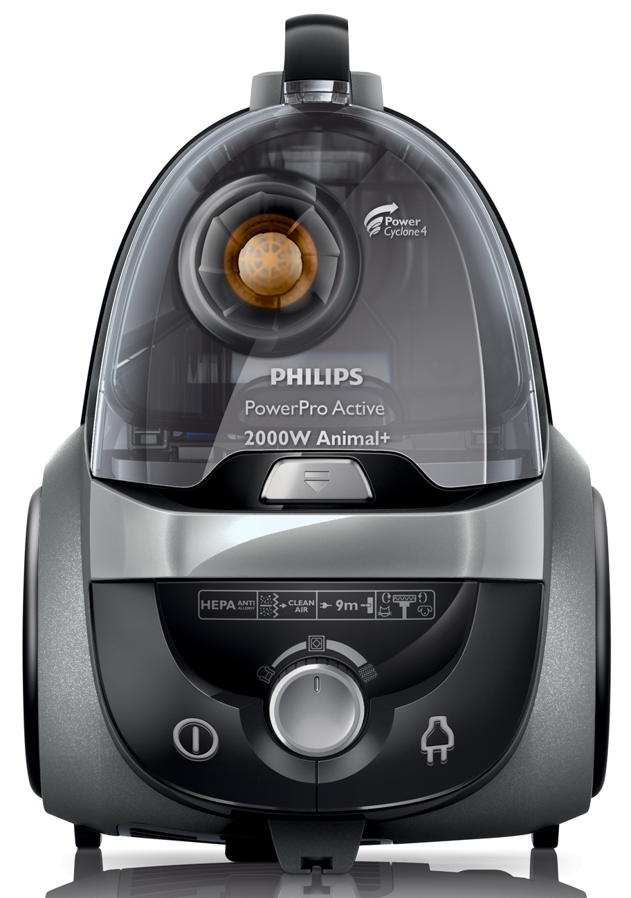 Der Staubsauger Philips PowerPro Active Animal+ ist ein beutelloser Sauger mit PowerCyclone-4-Technologie. Die Luft gelangt mit hoher Geschwindigkeit in die Luftkammer, wirbelt zyklonartig nach oben und trennt sich am Ende des Luftkanals schnell und effektiv vom Staub, der gleichmäßig in den Staubbehälter fällt. Der eingebaute HEPA-10-Filter hat eine besonders große Oberfläche. Sie verhindert frühzeitiges Verstopfen und ermöglicht so eine besonders hohe und lang anhaltende Leistung. Er bindet mikroskopisch kleine Partikel wie Hausstaub, Pollen oder Milben, die Allergien auslösen können.