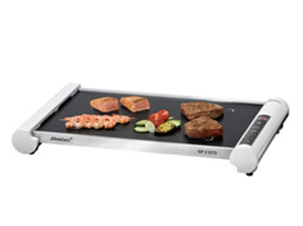 Der Steba Glasgrill GP 2 ECO ist in formschöner Tischgrill mit strapazierfähiger Glaskeramik-Grillfläche, die sich in weniger als fünf Minuten auf 250 Grad aufheizt. Diese geringe Aufheizleistung bringt bis zu 30 Prozent Stromersparnis im Vergleich zu herkömmlichen Grills – dafür steht der Beiname ECO. Die Cool-Touch-Griffe sorgen dafür, dass man den Grill auch während des Gebrauchs anders hinstellen kann, ohne sich zu verletzen. Der Steba Glasgrill verfügt außerdem über eine Low-Fat-Funktion. Das bedeutet, dass das Grillgut ohne zusätzliche Fettzugabe gegart werden kann. Die Poren schließen sofort, so dass wertvolles Eiweiß im Fleisch erhalten bleibt. Wird der Grill nicht gebraucht, kann er auch als Warmhaltplatte genutzt werden.