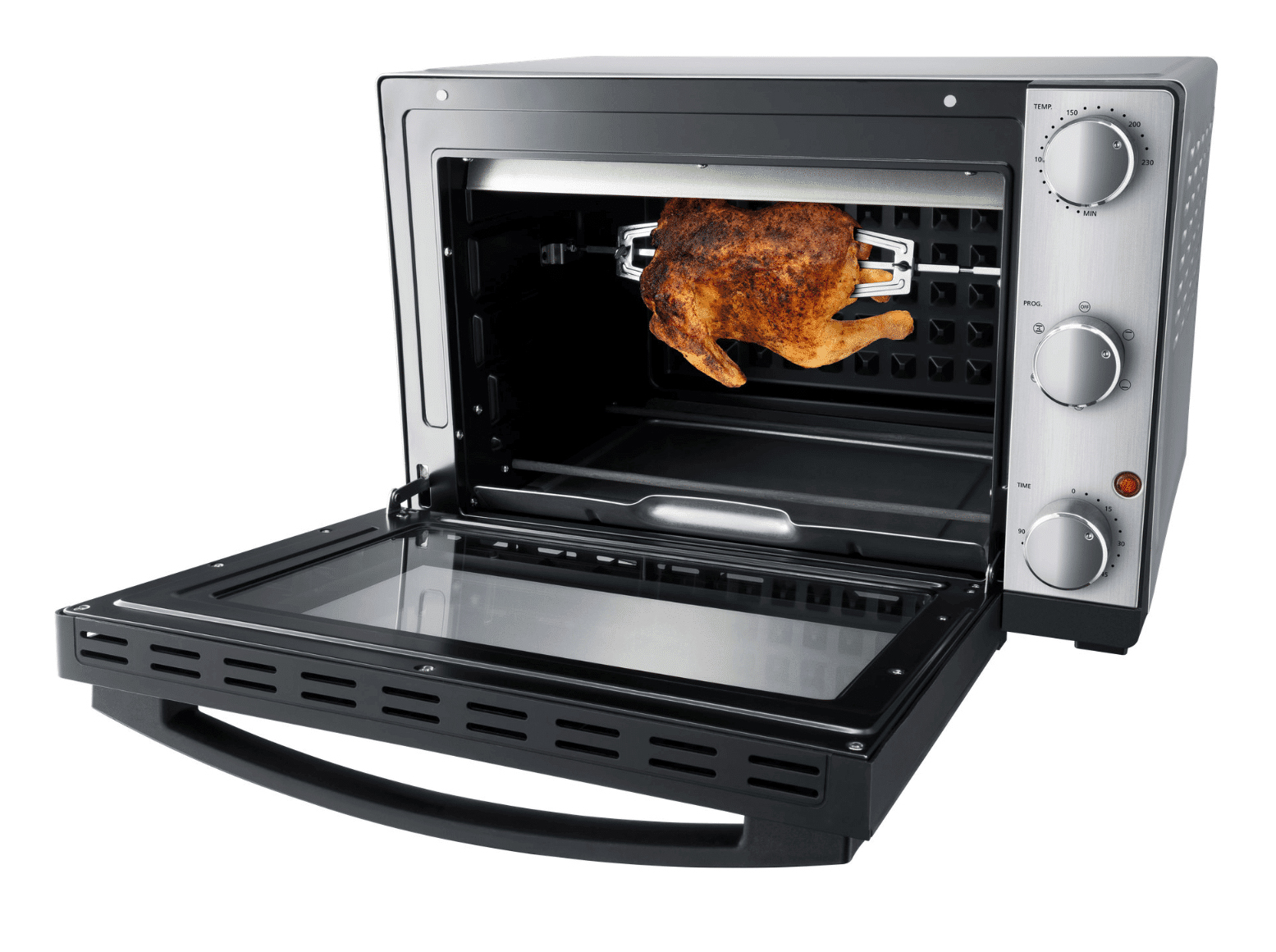 Eine stufenlose Temperaturregelung, Ober-/ Unterhitze, zuschaltbare Umluftfunktion und der 90-Minuten-Timer bieten Vielseitigkeit beim Backen – von krossen Pizzen bis hin zu zarten Aufläufen. Für Hähnchen oder Spießbraten steht der mitgelieferte Drehspieß bereit.