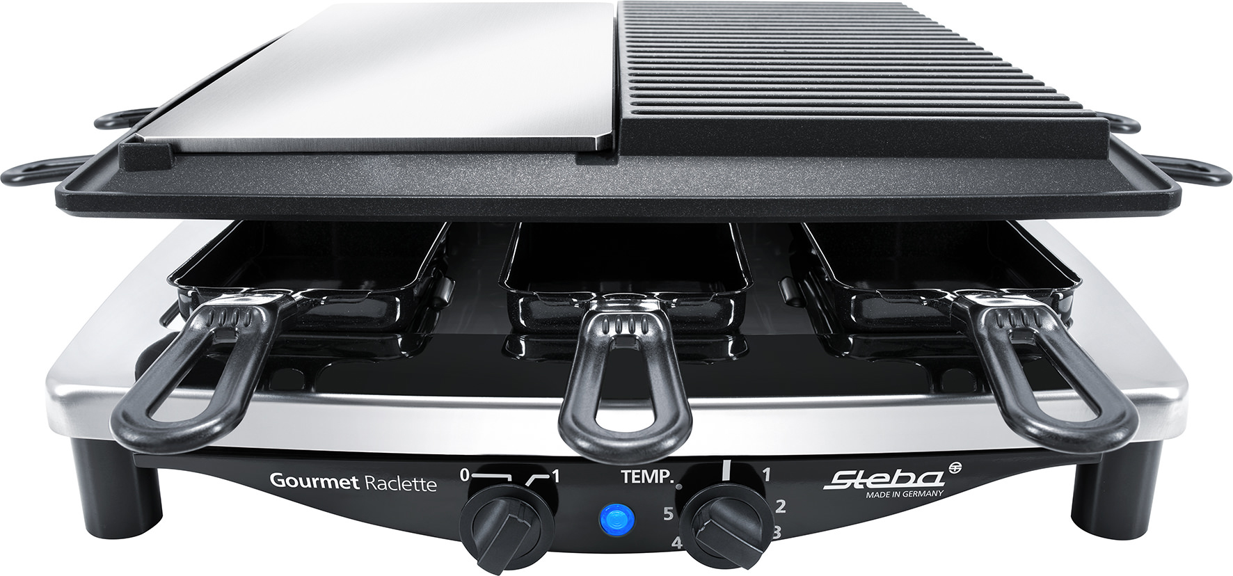 Das Steba Raclette RC 8 Steel Deluxe ist mit einem stufenlos regulierbaren Heizsystem ausgestattet, das nach kürzester Zeit hohe Grilltemperaturen erreicht. Auf einer Grillfläche von 29 x 29cm können 6-8 Personen gleichzeigt zu grillen.