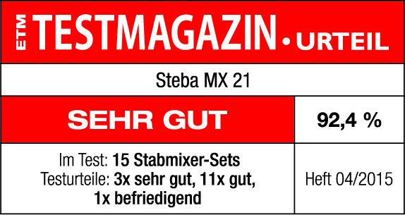 Im aktuellen Test des ETM-Testmagazins erzielte der Stabmixer MX 21 von Steba das Ergebnis „sehr gut“ und somit den 2. Platz unter 15 getesteten Geräten. Geprüft wurden unter anderem die Bereiche Handhabung, Ergebnis, Sicherheit, Verarbeitung und Lautstärke. Der Mixer im Edelstahlgehäuse verfügt unter anderem über eine stufenlose Geschwindigkeitsregulierung von 4 000 bis 13 000 U/Min. sowie eine Turbotaste für 16 000 U/Min. Sechs Aufsätze machen ihn vielseitig verwendbar zum Mixen und Pürieren von Früchten und Gemüse, zum Hacken von Fleisch und Gemüse, für Sahne, Shakes und Mixgetränke, leichtem Teig und Desserts oder zum Zerkleinern von Käse, Kräuter, Nüsse uvm.