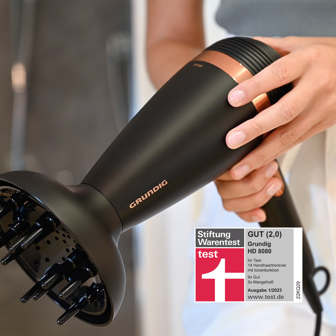 14 Haartrockner hat die Stiftung Warentest (StiWa) unter die Lupe genommen (Ausgabe 01/2023). Der Trockner HD 8080 von Grundig erhielt im Qualitätstest die Note „gut“ (2,0).