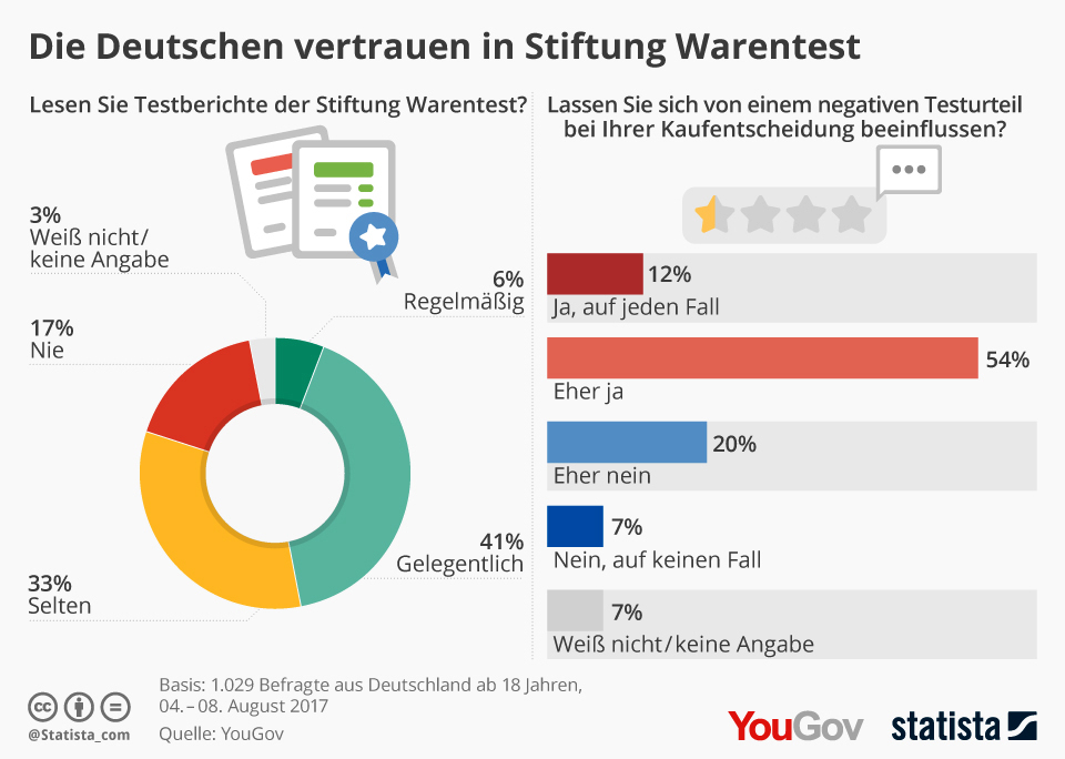 Beim Kauf eines neuen Produktes stehen viele Verbraucher vor einem Dschungel an Angeboten. Nicht immer ist es einfach, eine fundierte Kaufentscheidung zu treffen. Deshalb greifen viele Konsumenten auf unabhängige Testberichte wie die der Stiftung Warentest zurück. Laut einer aktuellen Umfrage von Statista in Zusammenarbeit mit YouGov lesen 80 Prozent der Deutschen zumindest gelegentlich Testberichte der Stiftung Warentest. Nur 17 Prozent nutzen diese Möglichkeit nie.