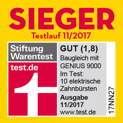 Die Zahnbürste ist die einzige im „test“-Test, die in der Hauptkategorie „Zahnreinigung“ mit einer Eins vor dem Komma und der Note „gut“ (1,7) überzeugt. Auch bei der Haltbarkeit und der Handhabung belegt die Genius 9000 mit den Noten „sehr gut“ (1,0) und „gut“ (2,3) Spitzenpositionen.