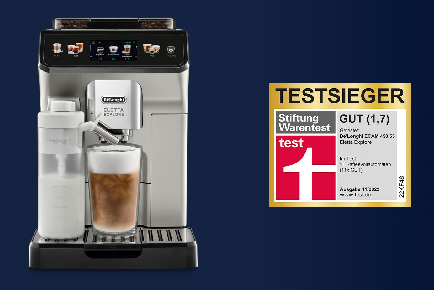 „Brüht gut und vielfältig“– so lobt Stiftung Warentest (StiWa) die Eletta Explore (ECAM450.55) von De’Longhi, die als Testsieger (1,7) den aktuellen Vergleichstest (11/2022) anführt, in dem elf Kaffeevollautomaten getestet wurden.