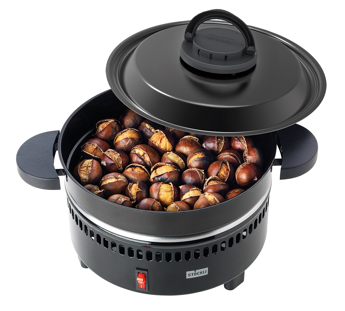 Bis zu 500 Gramm Maronen passen in den Topf aus Stahl-Email. Diesen nur kurz vorher erhitzen und dann die auf einer Seite aufgeschnittenen Maronen bei geschlossenem Deckel 15 Minuten heiß und knusprig werden lassen.