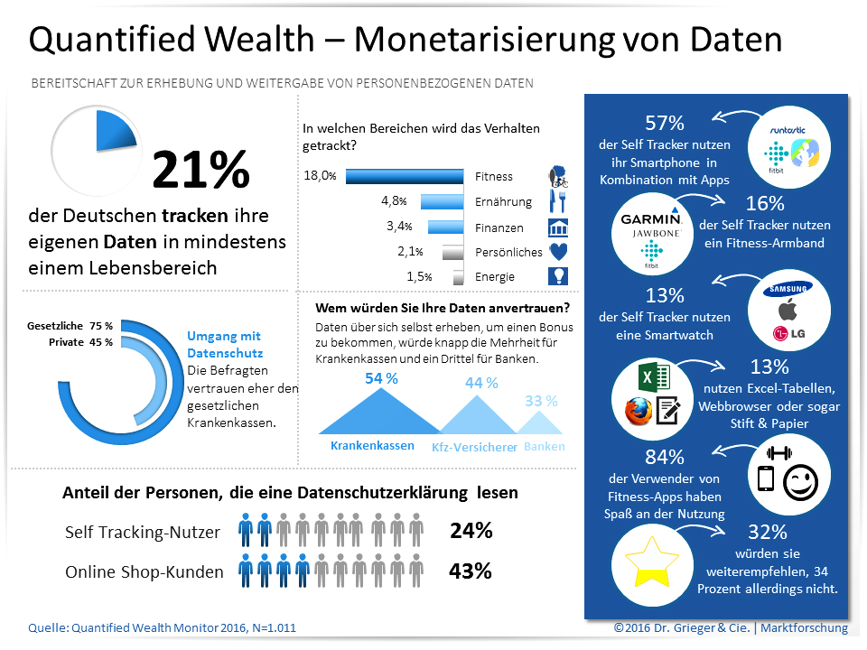 Das Marktforschungsinstitut Dr. Grieger & Cie. hat im Juni 2016 im Rahmen einer repräsentativen Umfrage 1.011 Verbraucher zwischen 15 und 69 Jahren zum Self Tracking und zur Weitergabebereitschaft persönlicher Daten online befragt. Insgesamt erheben demnach bereits 21 Prozent der Bevölkerung Daten zu ihrem eigenen Leben.