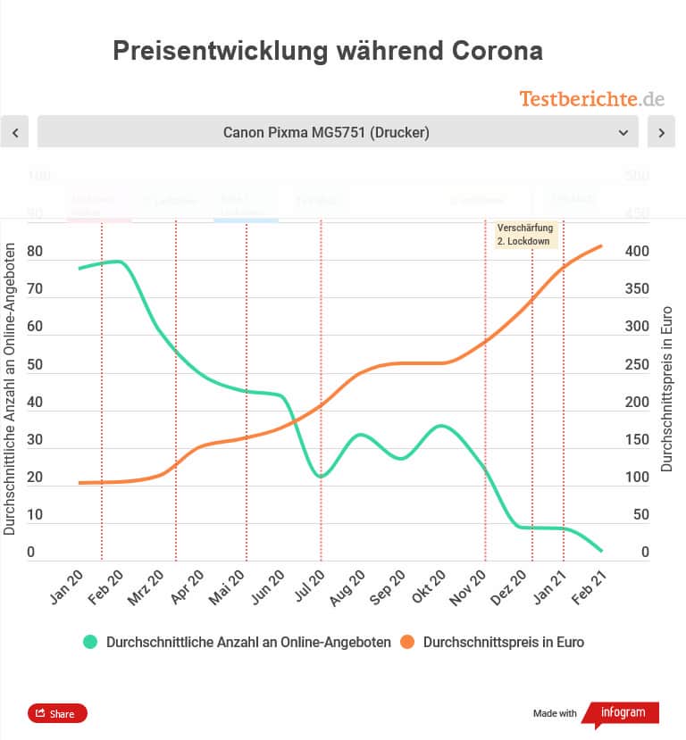 Bei einzelnen Modellen sind die Preisaufschläge besonders drastisch: Der Canon Drucker Pixma MG 5741 kostete im Februar 2020 durchschnittlich 104 Euro, ein Jahr später sind es fast 420 Euro – mehr als das Vierfache. Und wer im Februar 2020 die Kenwood Cooking Chef KM 096 kaufte, musste keine 1.000 Euro dafür hinblättern. Seit Jahresbeginn 2021 liegt die Küchenmaschine laut Testbericht.de nun bei 2.900 Euro, fast dreimal so viel. Doch Vorsicht: Dieser Mondpreis betrifft offenbar nur einen Anbieter. Und: “Absender” dieser Preiserhöhung ist nicht Kenwood. Hier ist besagtes Modell gar nicht mehr im Sortiment.